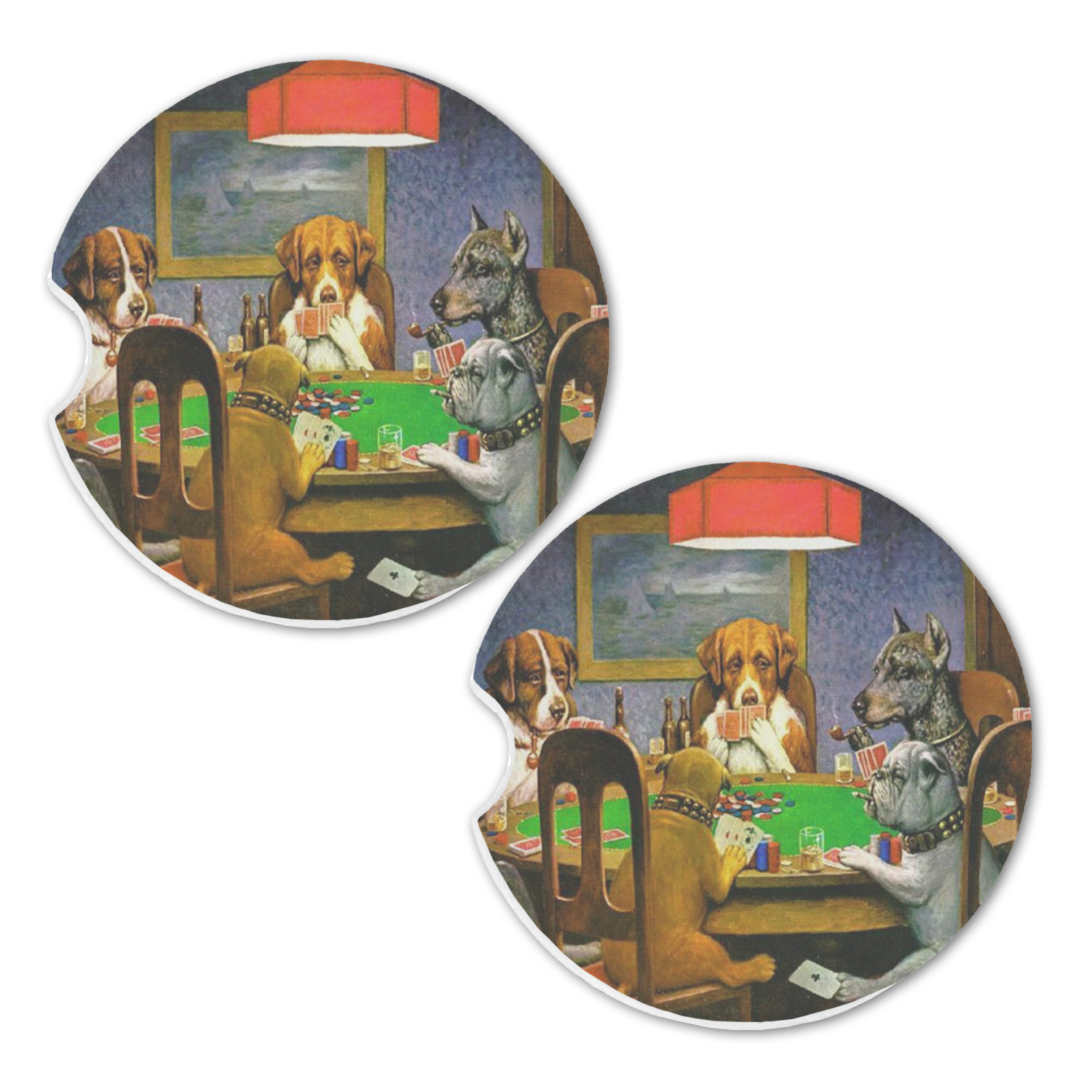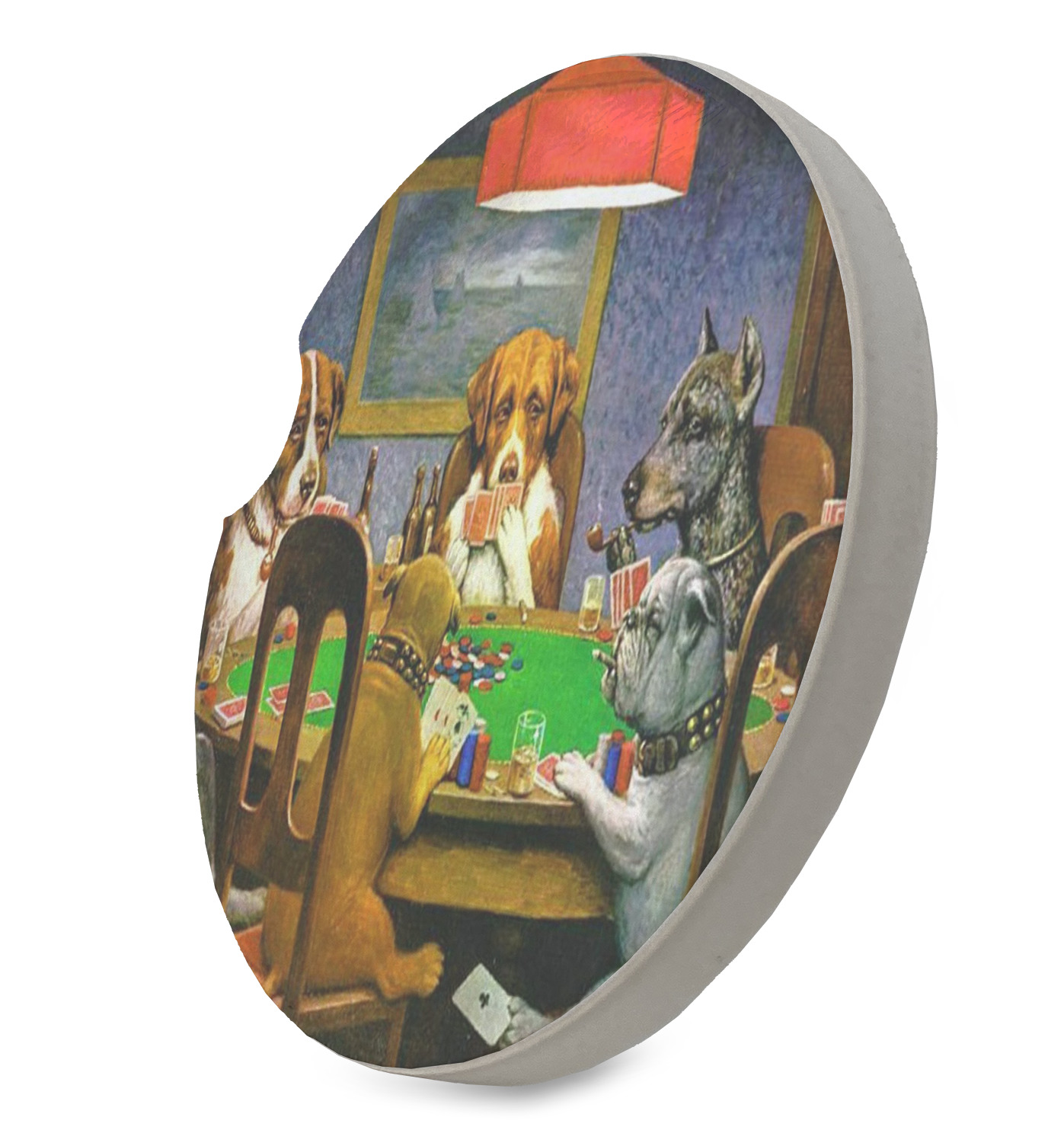 Dogs Playing Poker refers collectively to an 1894 painting, a series of sixteen oil paintings, and a 1910 painting by Cassius Marcellus Coolidge. Brown & Bigelow commissioned the 16 painting series in 1903 to advertise cigars. All eighteen paintings in the series feature personified dogs, but the eleven in which dogs are seated around a card table have become well known in the United States as examples of Kitsch art in home decoration. Source: Wikipedia