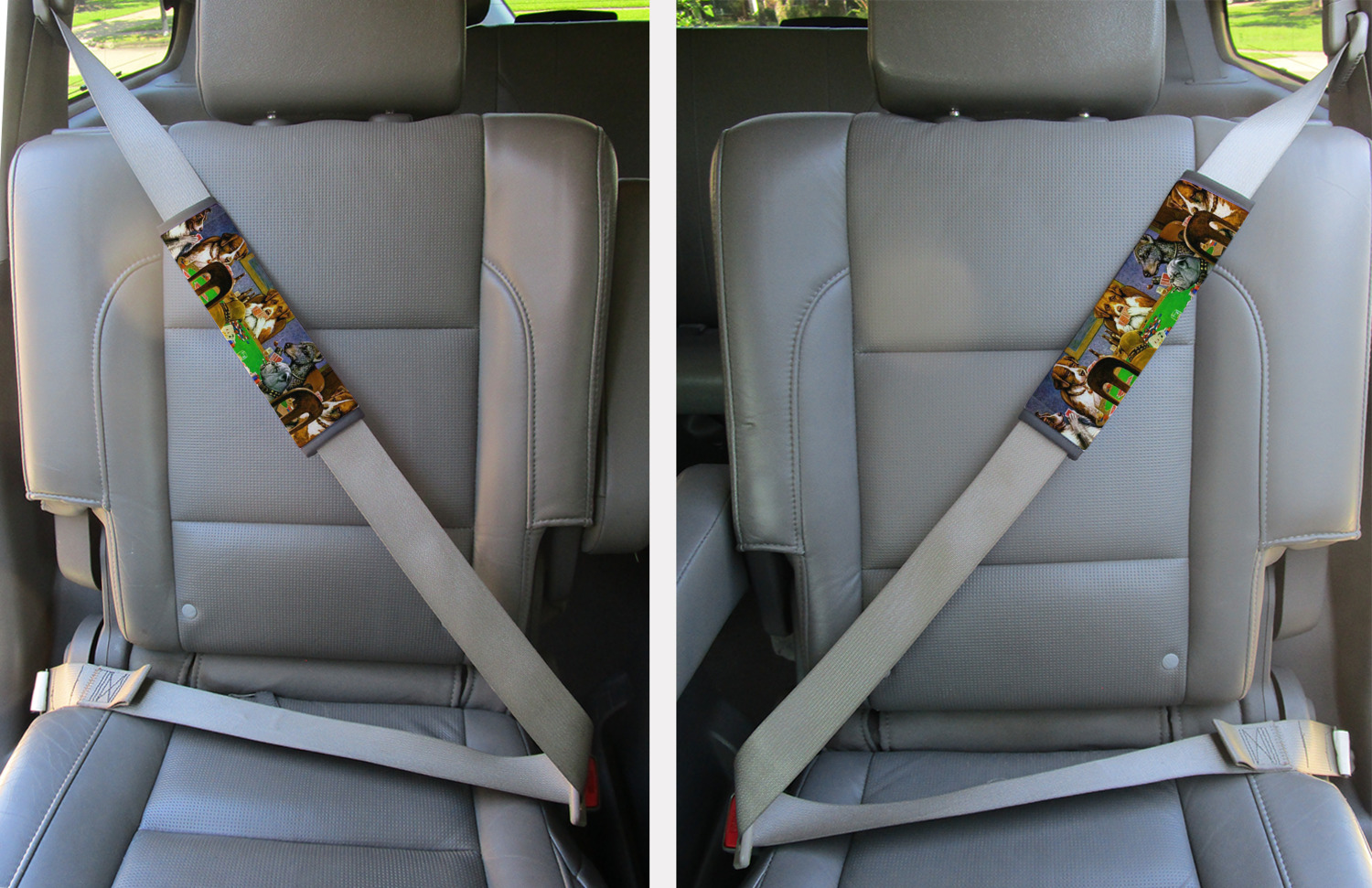 Made from neoprene, our seat belt strap covers wrap around the belt itself and have a Velcro tab for easy attachment and closure. The belt's edges are trimmed with a black polyester for a secure finish. Each cover is 9.5 by 7 inches when open and 9.5 by 2.5 inches when closed. We print your personalized design on the face of the seat belt pad.