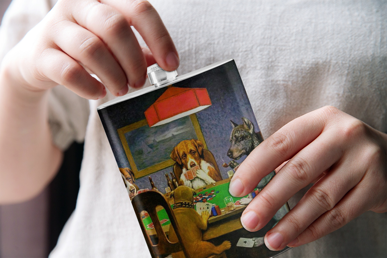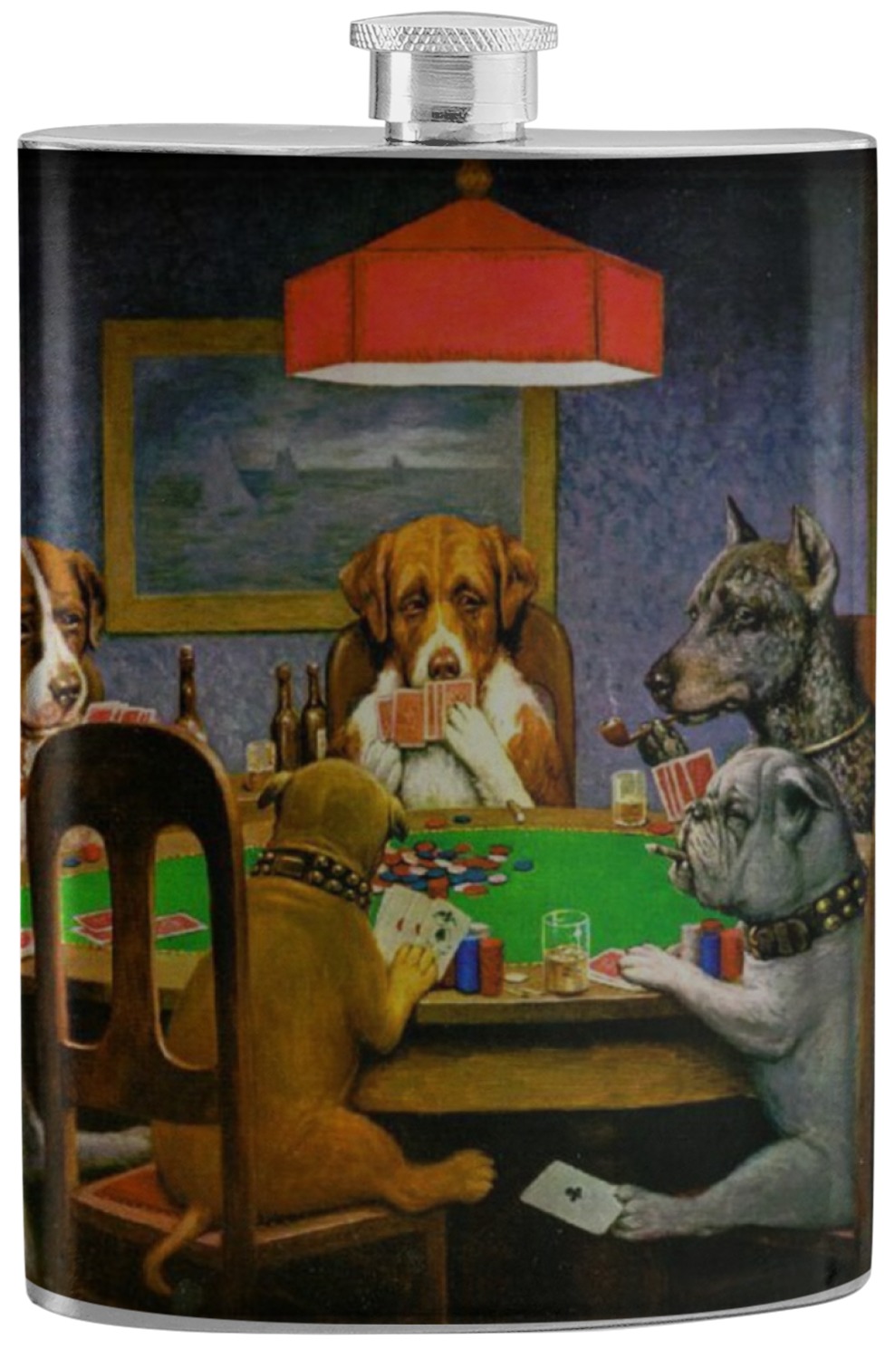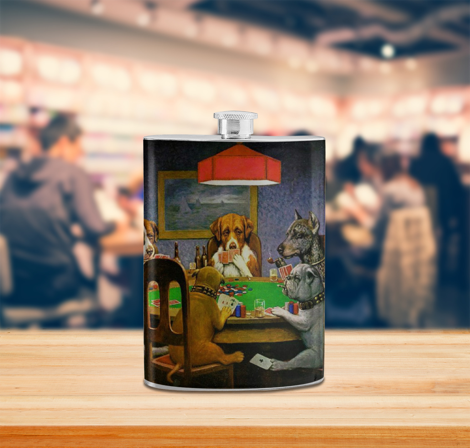 Dogs Playing Poker refers collectively to an 1894 painting, a series of sixteen oil paintings, and a 1910 painting by Cassius Marcellus Coolidge. Brown & Bigelow commissioned the 16 painting series in 1903 to advertise cigars. All eighteen paintings in the series feature personified dogs, but the eleven in which dogs are seated around a card table have become well known in the United States as examples of Kitsch art in home decoration. Source: Wikipedia