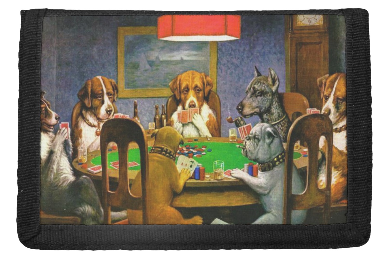 Dogs Playing Poker refers collectively to an 1894 painting, a series of sixteen oil paintings, and a 1910 painting by Cassius Marcellus Coolidge. Brown & Bigelow commissioned the 16 painting series in 1903 to advertise cigars. All eighteen paintings in the series feature personified dogs, but the eleven in which dogs are seated around a card table have become well known in the United States as examples of Kitsch art in home decoration. Source: Wikipedia