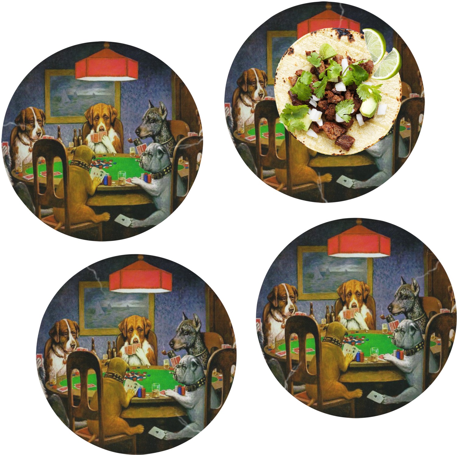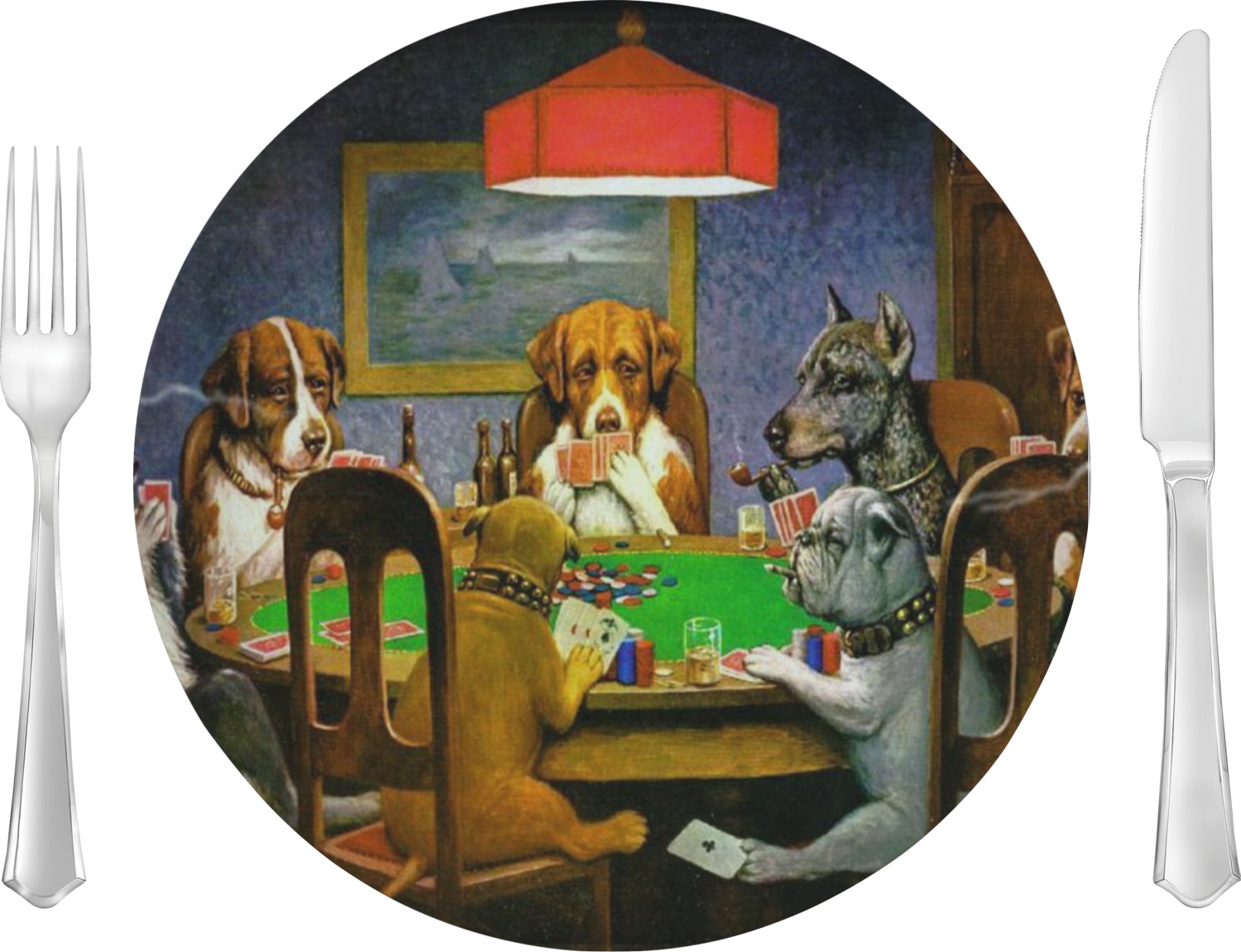 Dogs Playing Poker refers collectively to an 1894 painting, a series of sixteen oil paintings, and a 1910 painting by Cassius Marcellus Coolidge. Brown & Bigelow commissioned the 16 painting series in 1903 to advertise cigars. All eighteen paintings in the series feature personified dogs, but the eleven in which dogs are seated around a card table have become well known in the United States as examples of Kitsch art in home decoration. Source: Wikipedia
