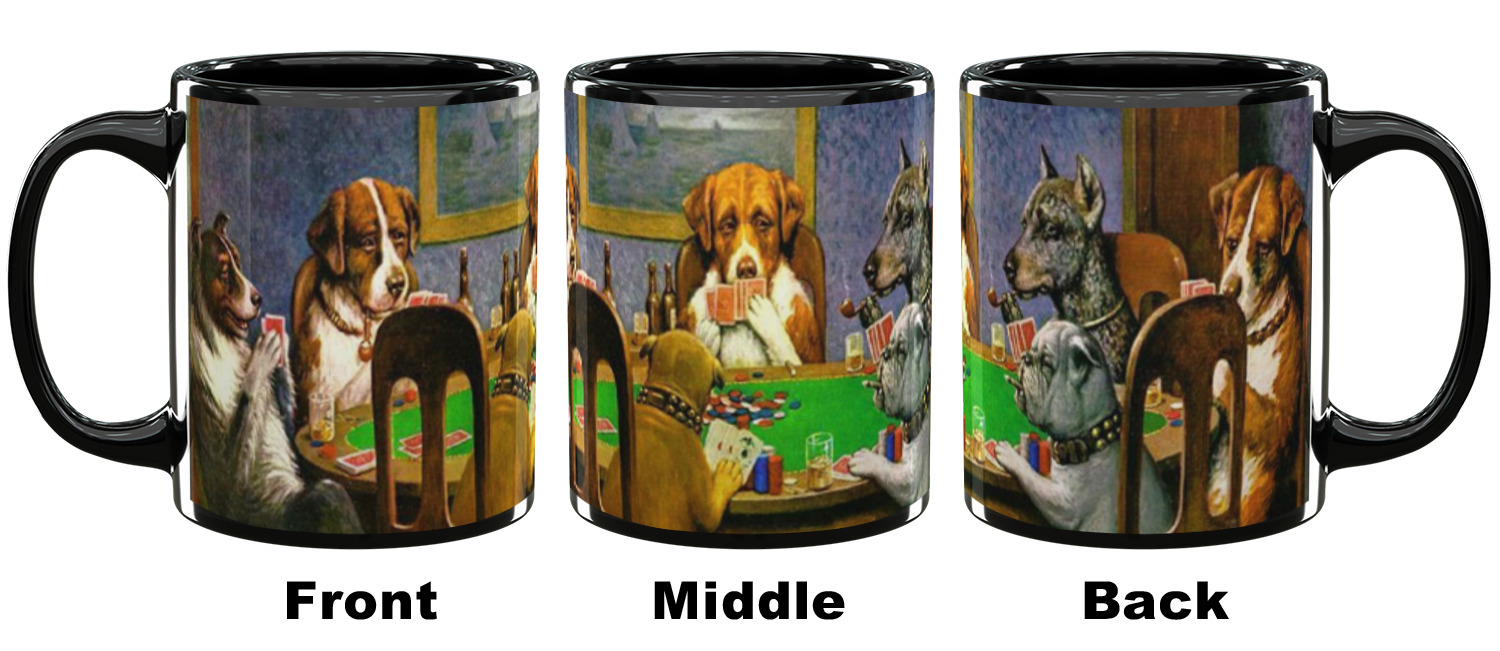 Dogs Playing Poker refers collectively to an 1894 painting, a series of sixteen oil paintings, and a 1910 painting by Cassius Marcellus Coolidge. Brown & Bigelow commissioned the 16 painting series in 1903 to advertise cigars. All eighteen paintings in the series feature personified dogs, but the eleven in which dogs are seated around a card table have become well known in the United States as examples of Kitsch art in home decoration. Source: Wikipedia