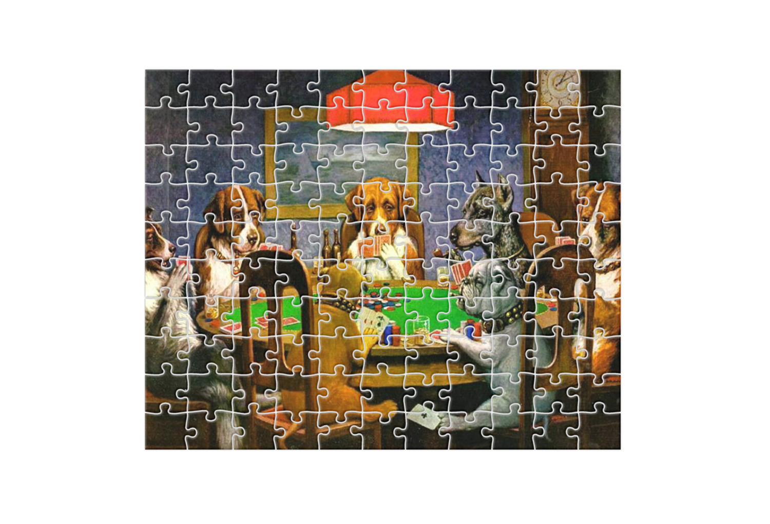 Dogs Playing Poker refers collectively to an 1894 painting, a series of sixteen oil paintings, and a 1910 painting by Cassius Marcellus Coolidge. Brown & Bigelow commissioned the 16 painting series in 1903 to advertise cigars. All eighteen paintings in the series feature personified dogs, but the eleven in which dogs are seated around a card table have become well known in the United States as examples of Kitsch art in home decoration. Source: Wikipedia