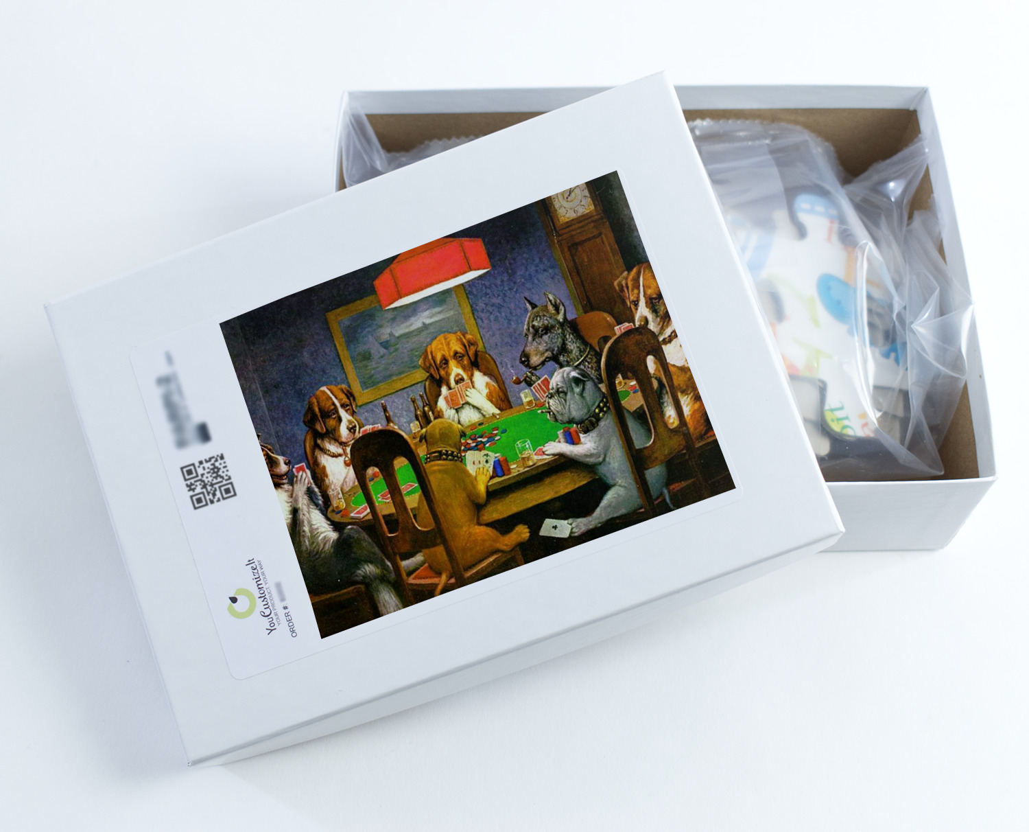 We print our puzzles on thick white chipboard in vibrant colors, then laminate the chipboard and die cut your puzzle. Your jigsaw puzzle is shipped to you in a box with the image of the puzzle on the box.