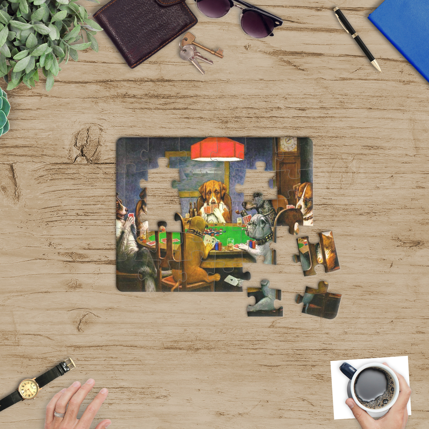 Dogs Playing Poker refers collectively to an 1894 painting, a series of sixteen oil paintings, and a 1910 painting by Cassius Marcellus Coolidge. Brown & Bigelow commissioned the 16 painting series in 1903 to advertise cigars. All eighteen paintings in the series feature personified dogs, but the eleven in which dogs are seated around a card table have become well known in the United States as examples of Kitsch art in home decoration. Source: Wikipedia