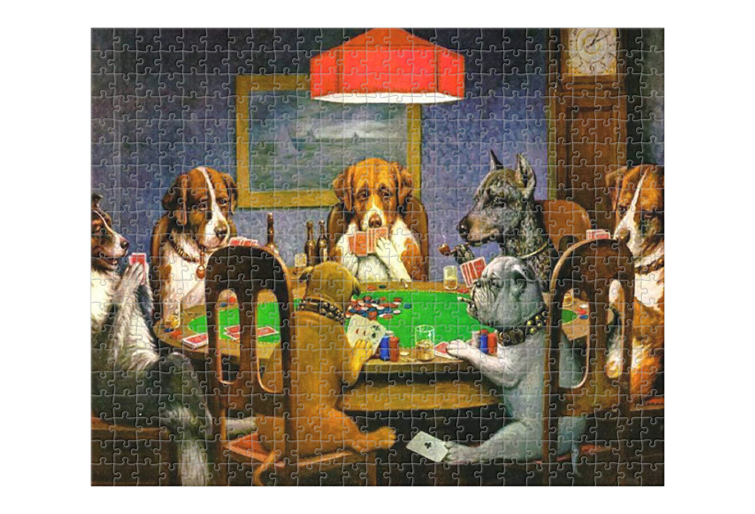 Dogs Playing Poker refers collectively to an 1894 painting, a series of sixteen oil paintings, and a 1910 painting by Cassius Marcellus Coolidge. Brown & Bigelow commissioned the 16 painting series in 1903 to advertise cigars. All eighteen paintings in the series feature personified dogs, but the eleven in which dogs are seated around a card table have become well known in the United States as examples of Kitsch art in home decoration. Source: Wikipedia