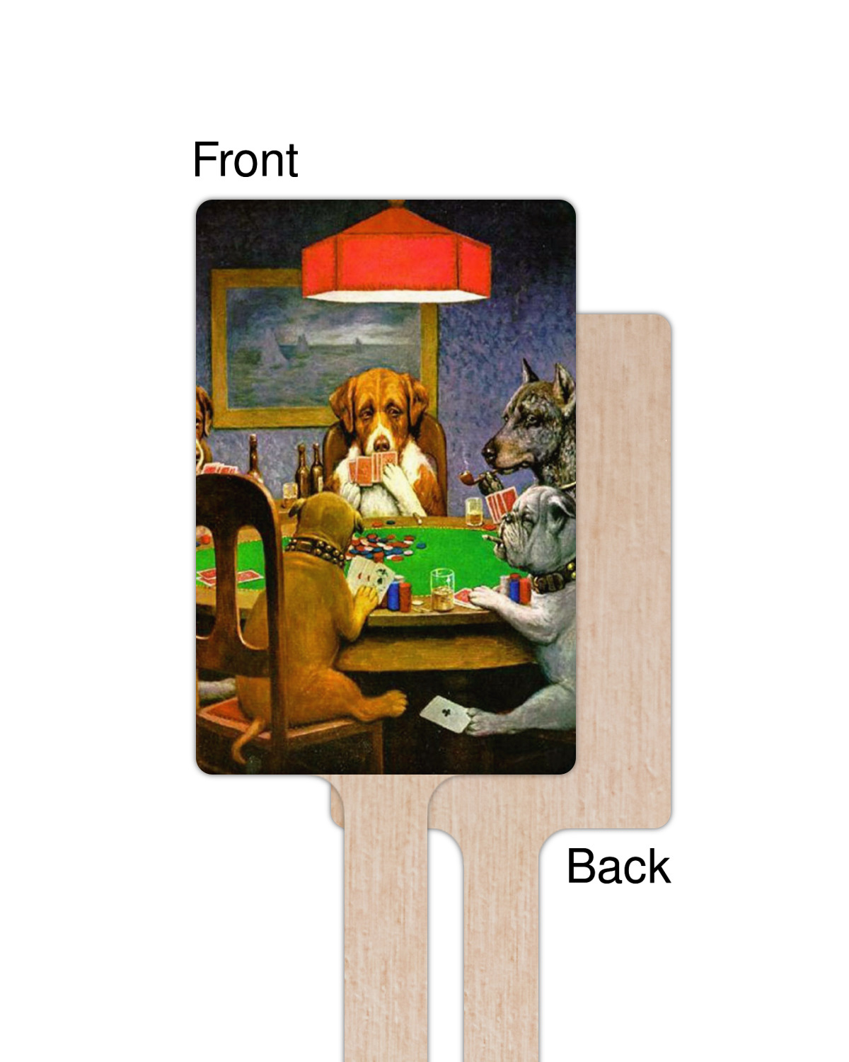 Dogs Playing Poker refers collectively to an 1894 painting, a series of sixteen oil paintings, and a 1910 painting by Cassius Marcellus Coolidge. Brown & Bigelow commissioned the 16 painting series in 1903 to advertise cigars. All eighteen paintings in the series feature personified dogs, but the eleven in which dogs are seated around a card table have become well known in the United States as examples of Kitsch art in home decoration. Source: Wikipedia
