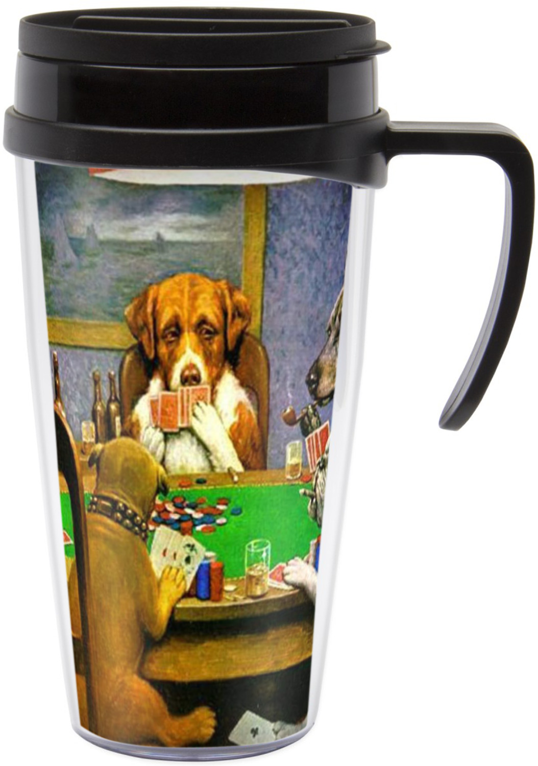 Dogs Playing Poker refers collectively to an 1894 painting, a series of sixteen oil paintings, and a 1910 painting by Cassius Marcellus Coolidge. Brown & Bigelow commissioned the 16 painting series in 1903 to advertise cigars. All eighteen paintings in the series feature personified dogs, but the eleven in which dogs are seated around a card table have become well known in the United States as examples of Kitsch art in home decoration. Source: Wikipedia
