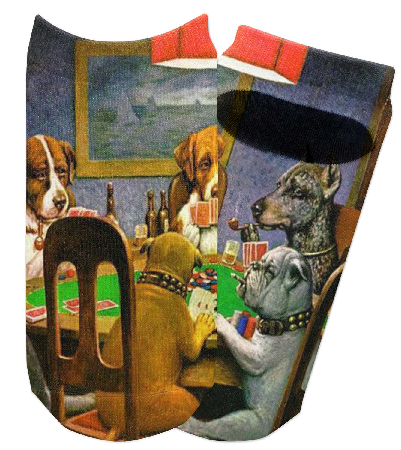 Dogs Playing Poker refers collectively to an 1894 painting, a series of sixteen oil paintings, and a 1910 painting by Cassius Marcellus Coolidge. Brown & Bigelow commissioned the 16 painting series in 1903 to advertise cigars. All eighteen paintings in the series feature personified dogs, but the eleven in which dogs are seated around a card table have become well known in the United States as examples of Kitsch art in home decoration. Source: Wikipedia