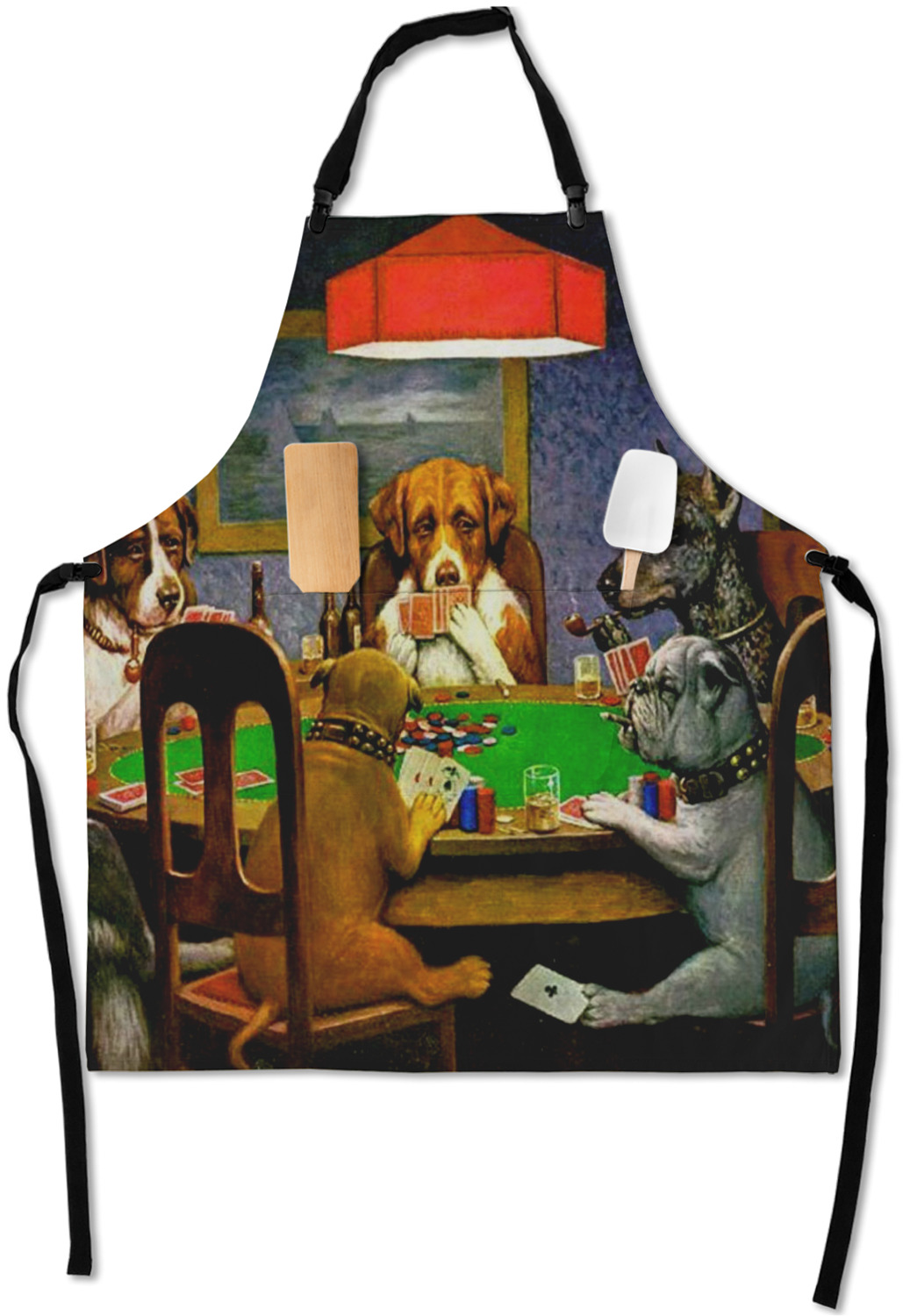 Dogs Playing Poker refers collectively to an 1894 painting, a series of sixteen oil paintings, and a 1910 painting by Cassius Marcellus Coolidge. Brown & Bigelow commissioned the 16 painting series in 1903 to advertise cigars. All eighteen paintings in the series feature personified dogs, but the eleven in which dogs are seated around a card table have become well known in the United States as examples of Kitsch art in home decoration. Source: Wikipedia