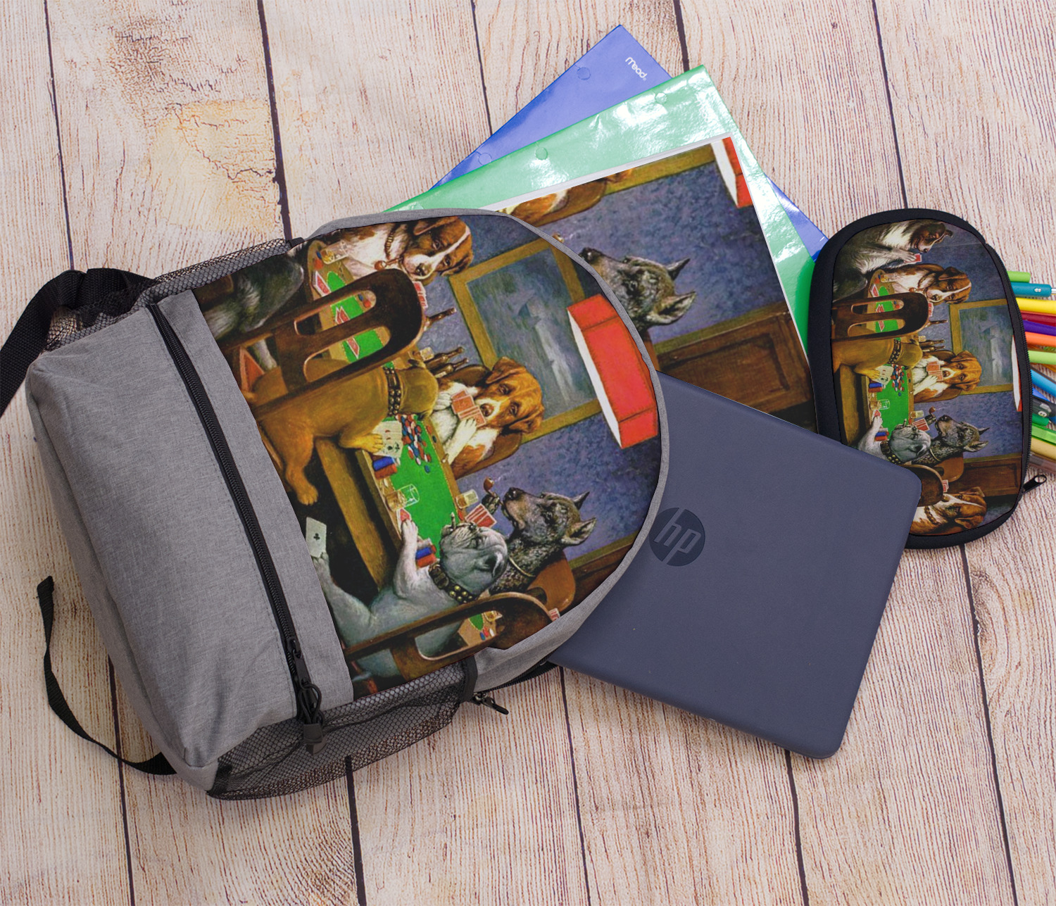 Dogs Playing Poker refers collectively to an 1894 painting, a series of sixteen oil paintings, and a 1910 painting by Cassius Marcellus Coolidge. Brown & Bigelow commissioned the 16 painting series in 1903 to advertise cigars. All eighteen paintings in the series feature personified dogs, but the eleven in which dogs are seated around a card table have become well known in the United States as examples of Kitsch art in home decoration. Source: Wikipedia