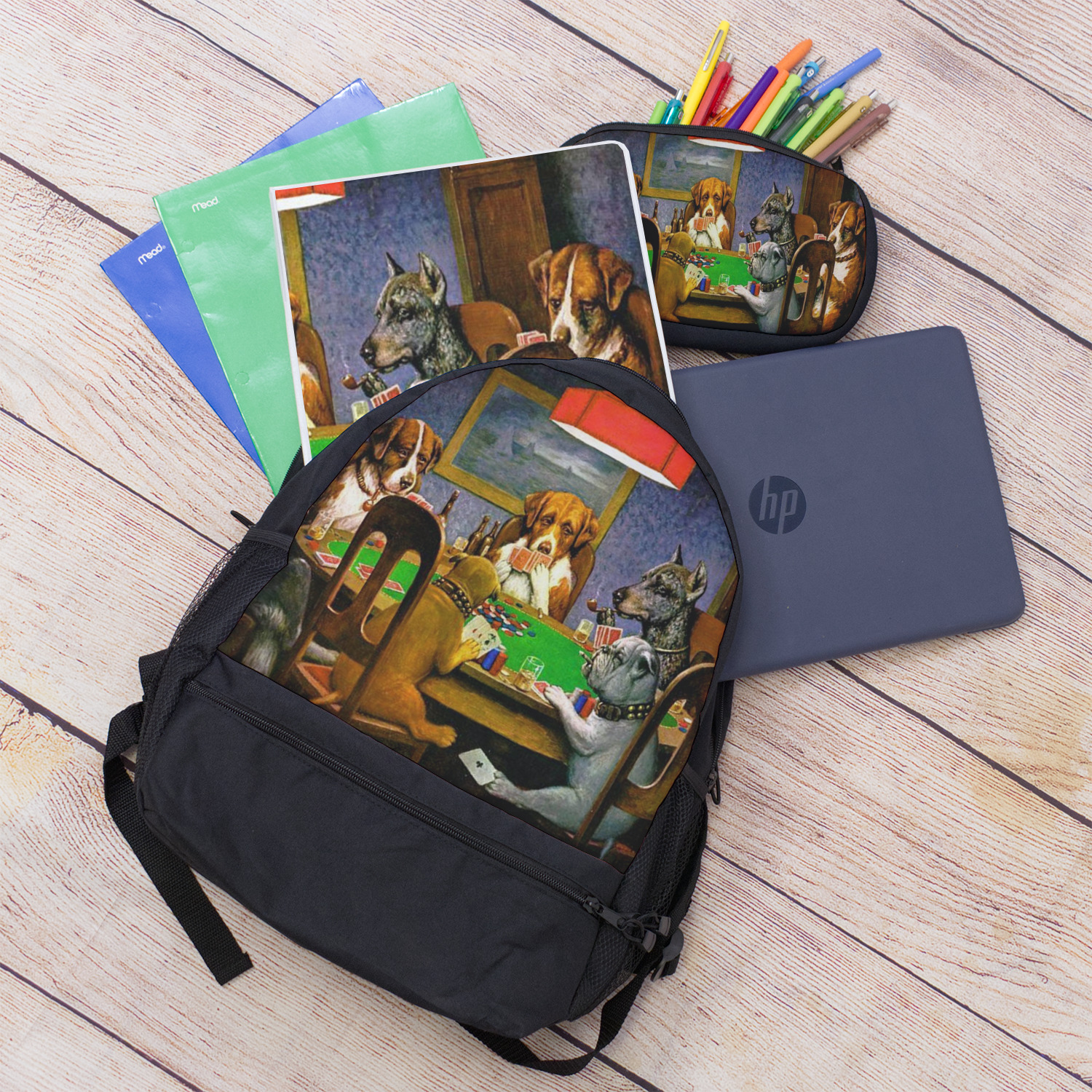 Dogs Playing Poker refers collectively to an 1894 painting, a series of sixteen oil paintings, and a 1910 painting by Cassius Marcellus Coolidge. Brown & Bigelow commissioned the 16 painting series in 1903 to advertise cigars. All eighteen paintings in the series feature personified dogs, but the eleven in which dogs are seated around a card table have become well known in the United States as examples of Kitsch art in home decoration. Source: Wikipedia