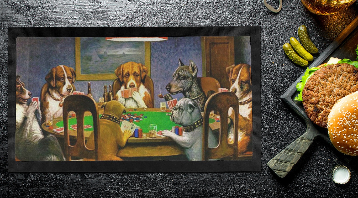 Dogs Playing Poker refers collectively to an 1894 painting, a series of sixteen oil paintings, and a 1910 painting by Cassius Marcellus Coolidge. Brown & Bigelow commissioned the 16 painting series in 1903 to advertise cigars. All eighteen paintings in the series feature personified dogs, but the eleven in which dogs are seated around a card table have become well known in the United States as examples of Kitsch art in home decoration. Source: Wikipedia