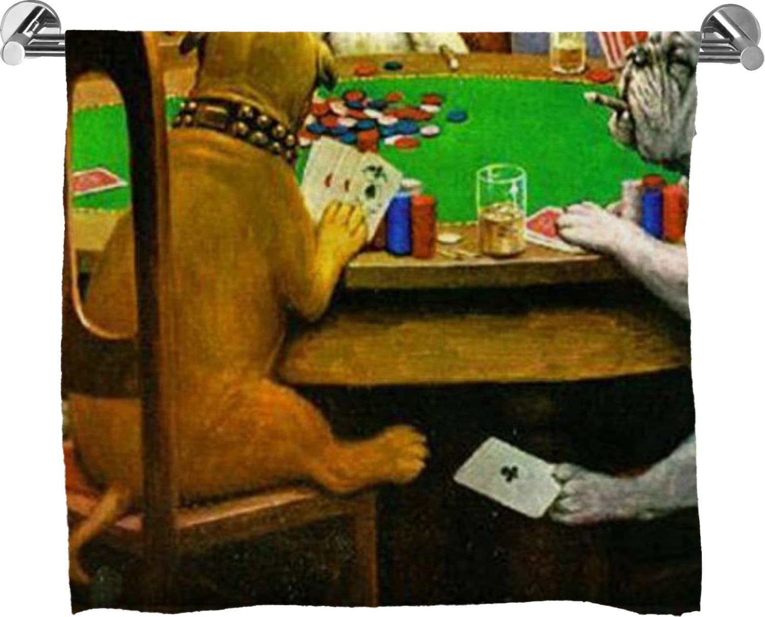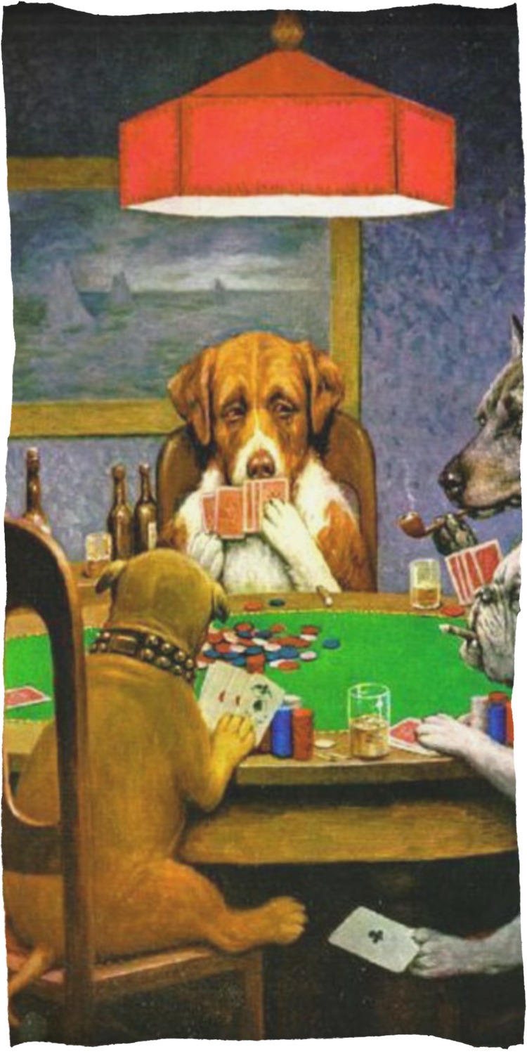 Dogs Playing Poker refers collectively to an 1894 painting, a series of sixteen oil paintings, and a 1910 painting by Cassius Marcellus Coolidge. Brown & Bigelow commissioned the 16 painting series in 1903 to advertise cigars. All eighteen paintings in the series feature personified dogs, but the eleven in which dogs are seated around a card table have become well known in the United States as examples of Kitsch art in home decoration. Source: Wikipedia