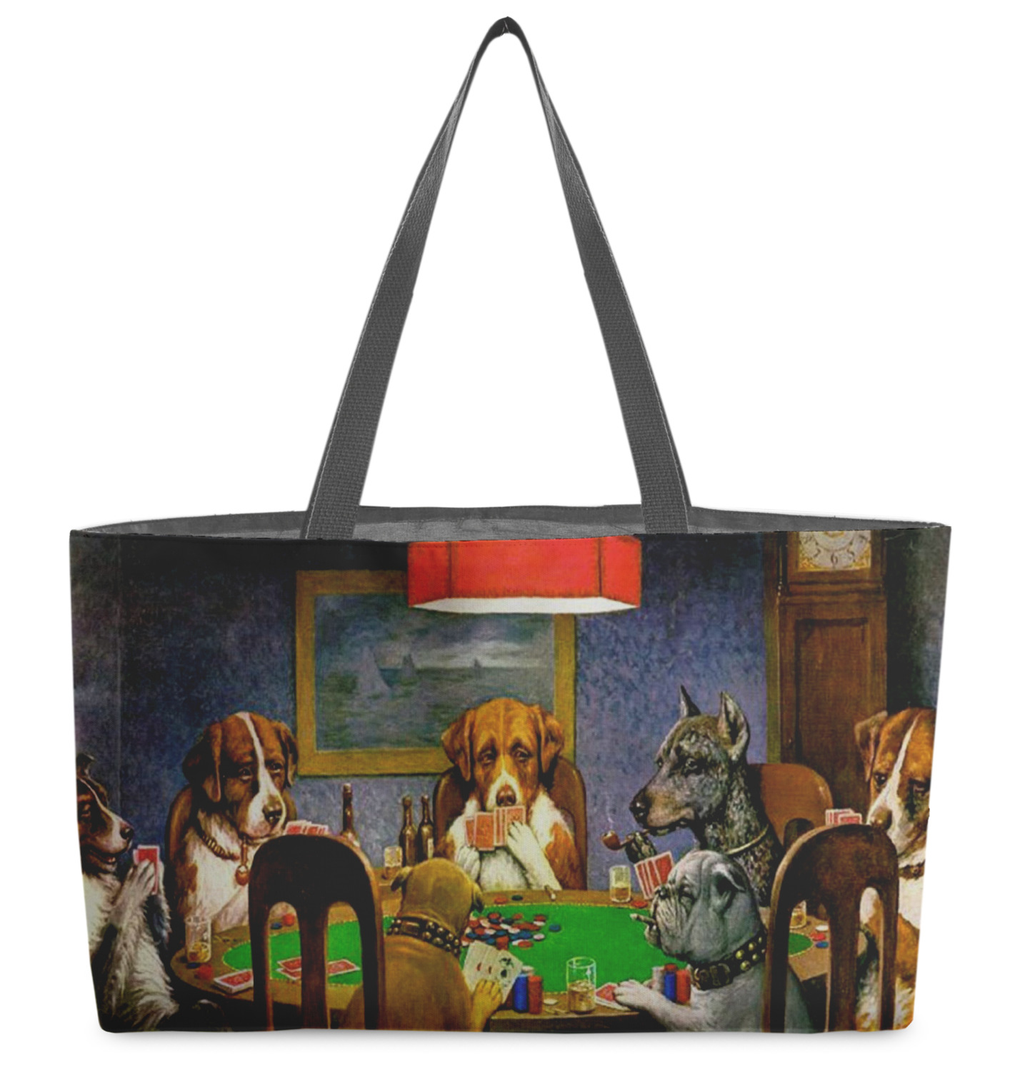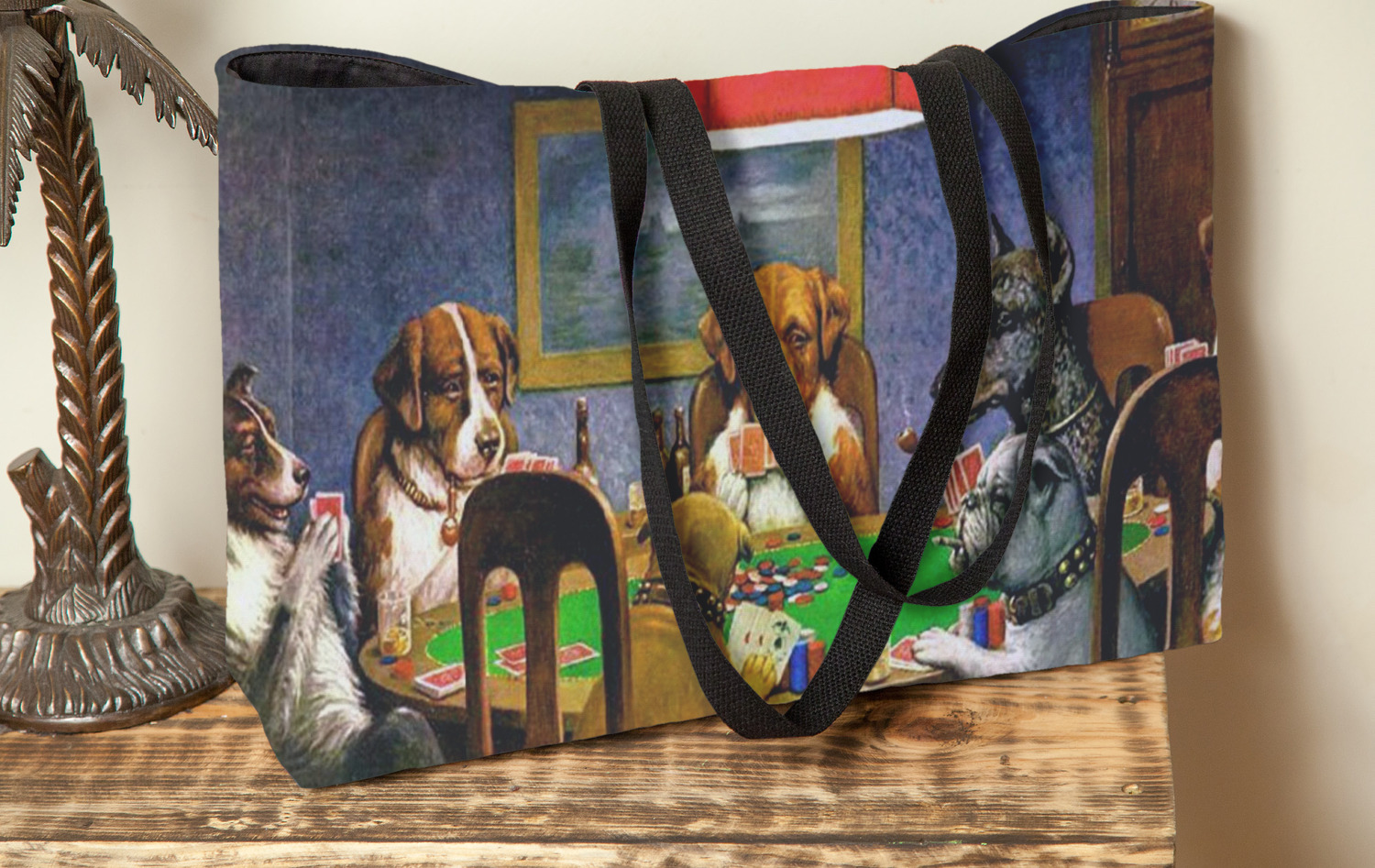 Dogs Playing Poker refers collectively to an 1894 painting, a series of sixteen oil paintings, and a 1910 painting by Cassius Marcellus Coolidge. Brown & Bigelow commissioned the 16 painting series in 1903 to advertise cigars. All eighteen paintings in the series feature personified dogs, but the eleven in which dogs are seated around a card table have become well known in the United States as examples of Kitsch art in home decoration. Source: Wikipedia
