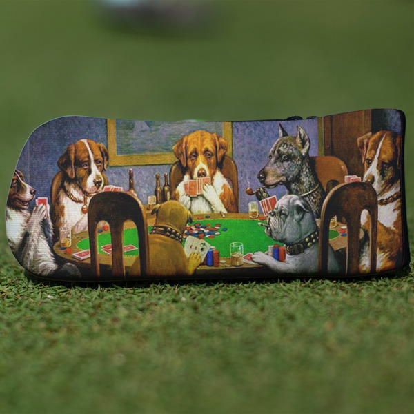 Dogs Playing Poker refers collectively to an 1894 painting, a series of sixteen oil paintings, and a 1910 painting by Cassius Marcellus Coolidge. Brown & Bigelow commissioned the 16 painting series in 1903 to advertise cigars. All eighteen paintings in the series feature personified dogs, but the eleven in which dogs are seated around a card table have become well known in the United States as examples of Kitsch art in home decoration. Source: Wikipedia