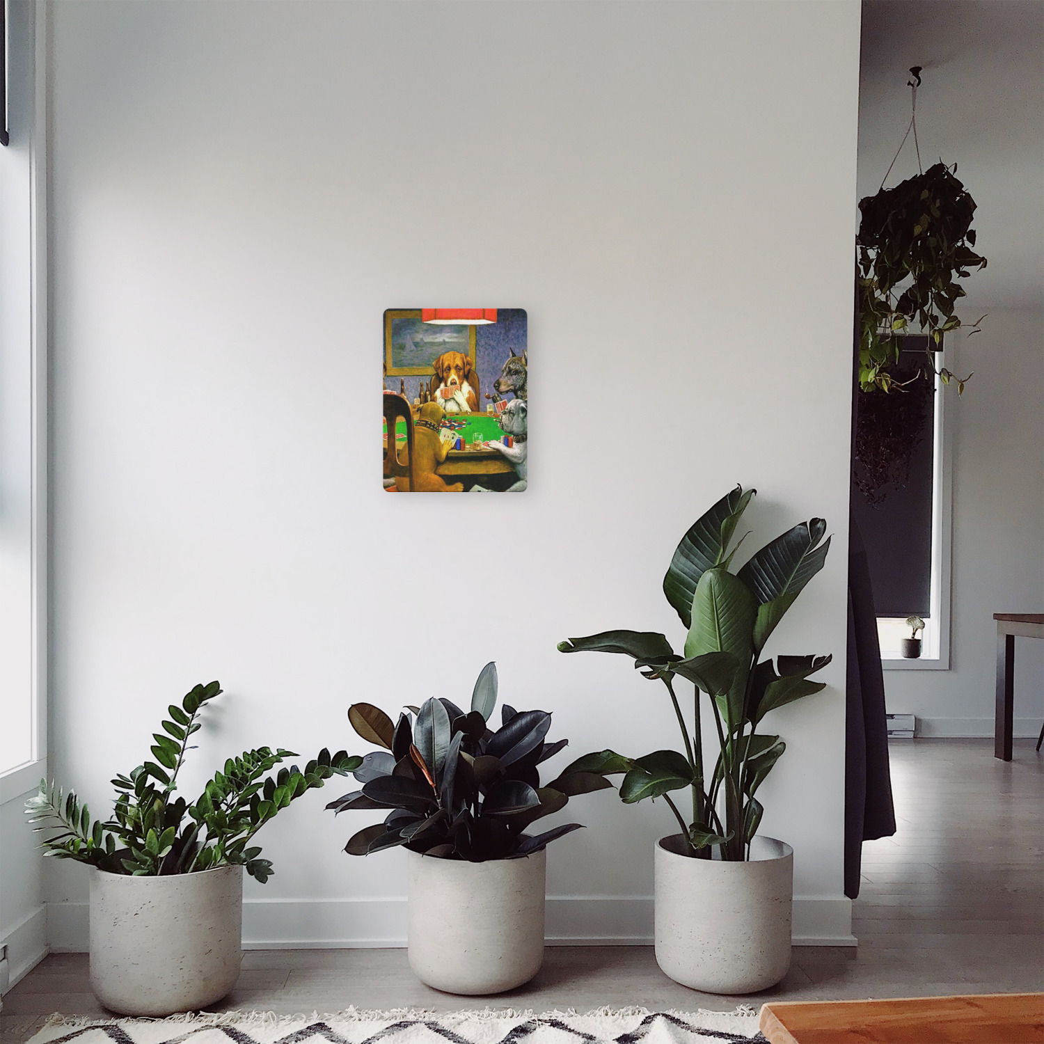 Dogs Playing Poker refers collectively to an 1894 painting, a series of sixteen oil paintings, and a 1910 painting by Cassius Marcellus Coolidge. Brown & Bigelow commissioned the 16 painting series in 1903 to advertise cigars. All eighteen paintings in the series feature personified dogs, but the eleven in which dogs are seated around a card table have become well known in the United States as examples of Kitsch art in home decoration. Source: Wikipedia