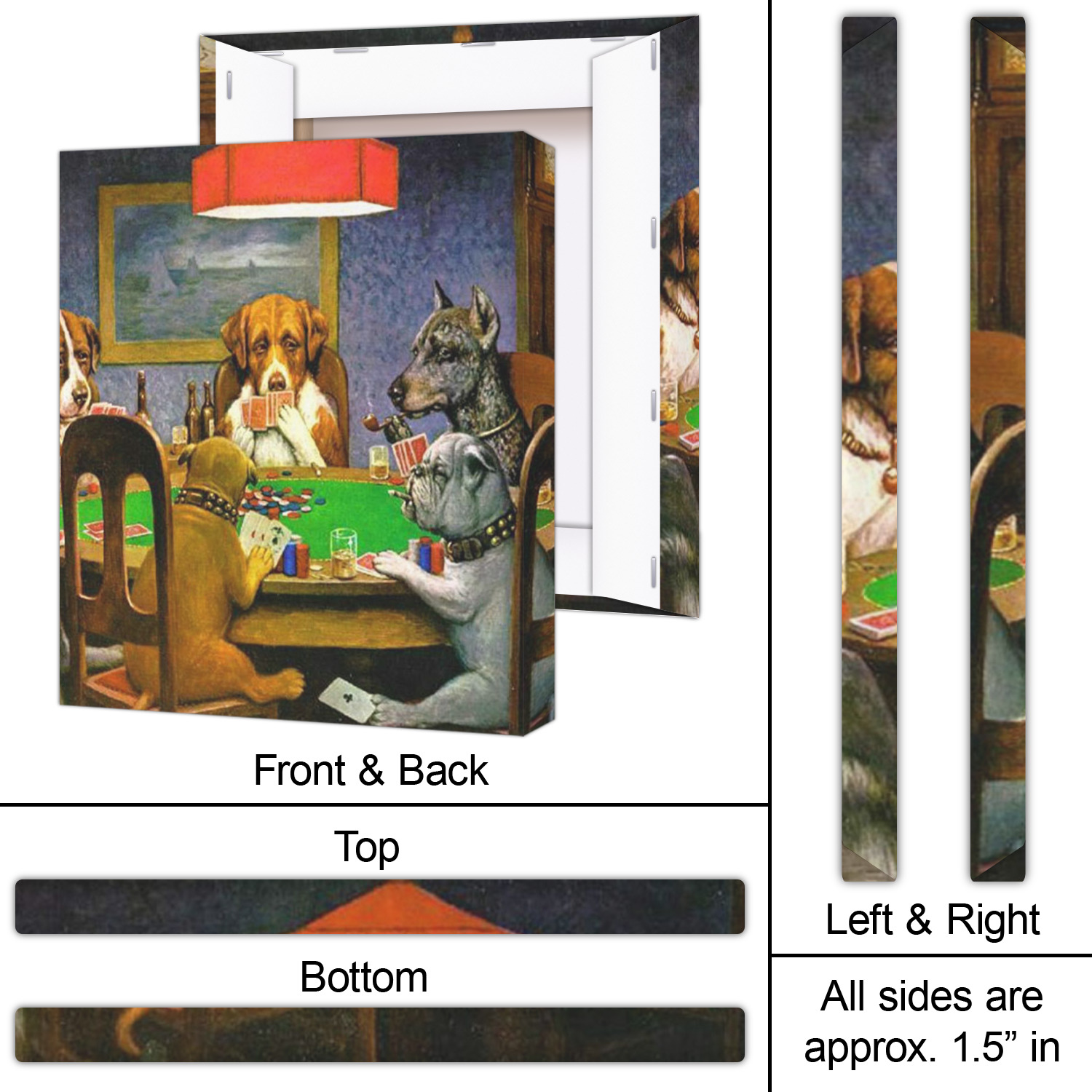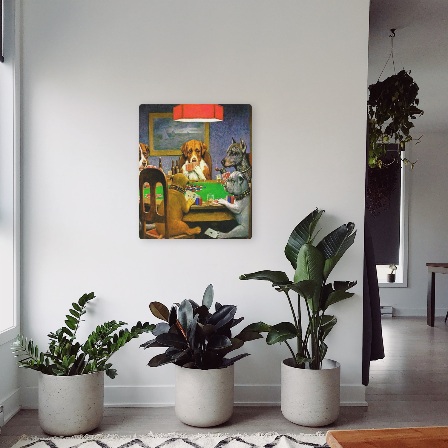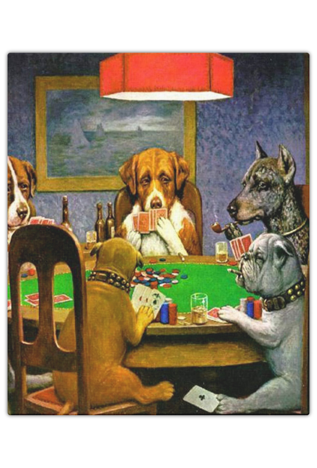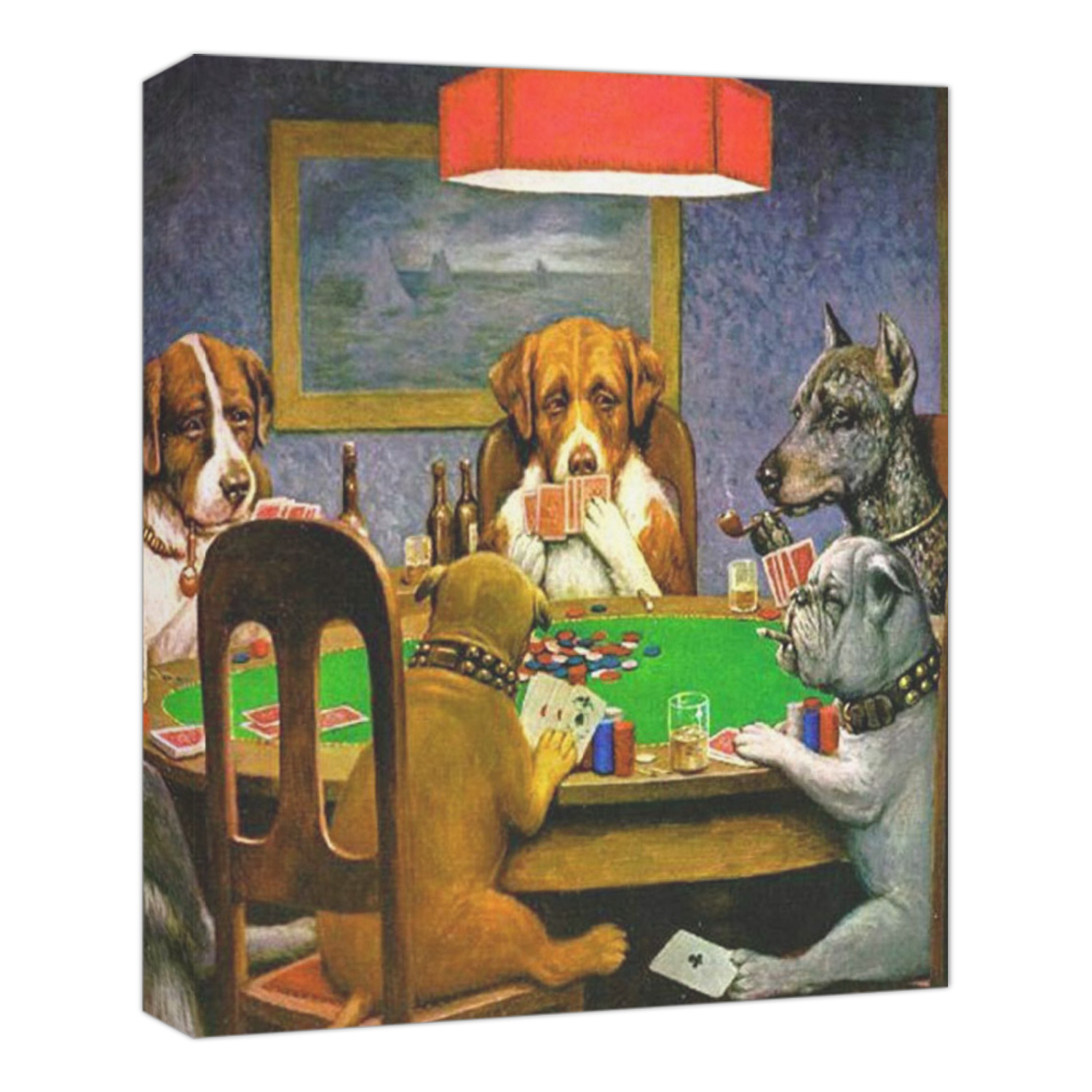 Dogs Playing Poker refers collectively to an 1894 painting, a series of sixteen oil paintings, and a 1910 painting by Cassius Marcellus Coolidge. Brown & Bigelow commissioned the 16 painting series in 1903 to advertise cigars. All eighteen paintings in the series feature personified dogs, but the eleven in which dogs are seated around a card table have become well known in the United States as examples of Kitsch art in home decoration. Source: Wikipedia
