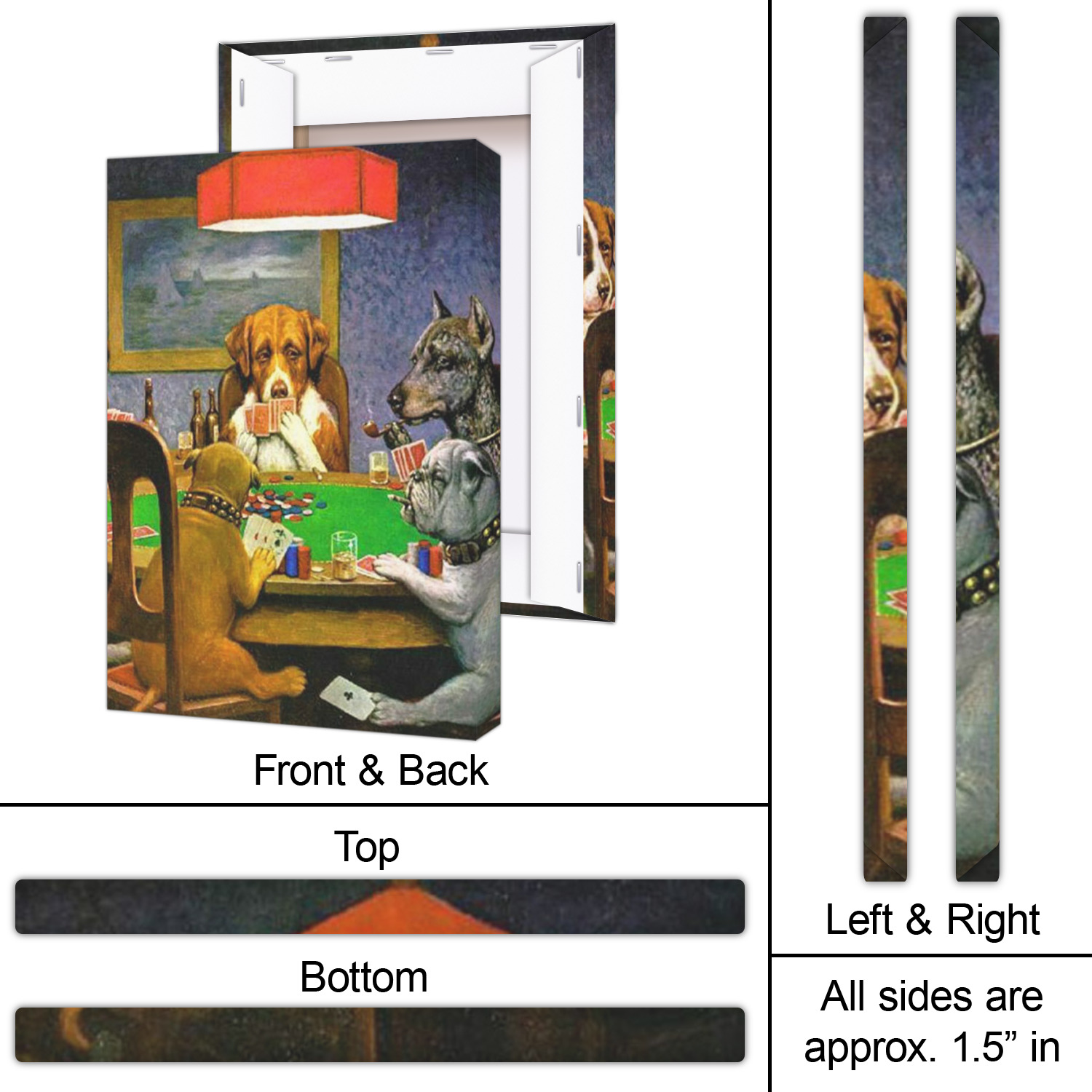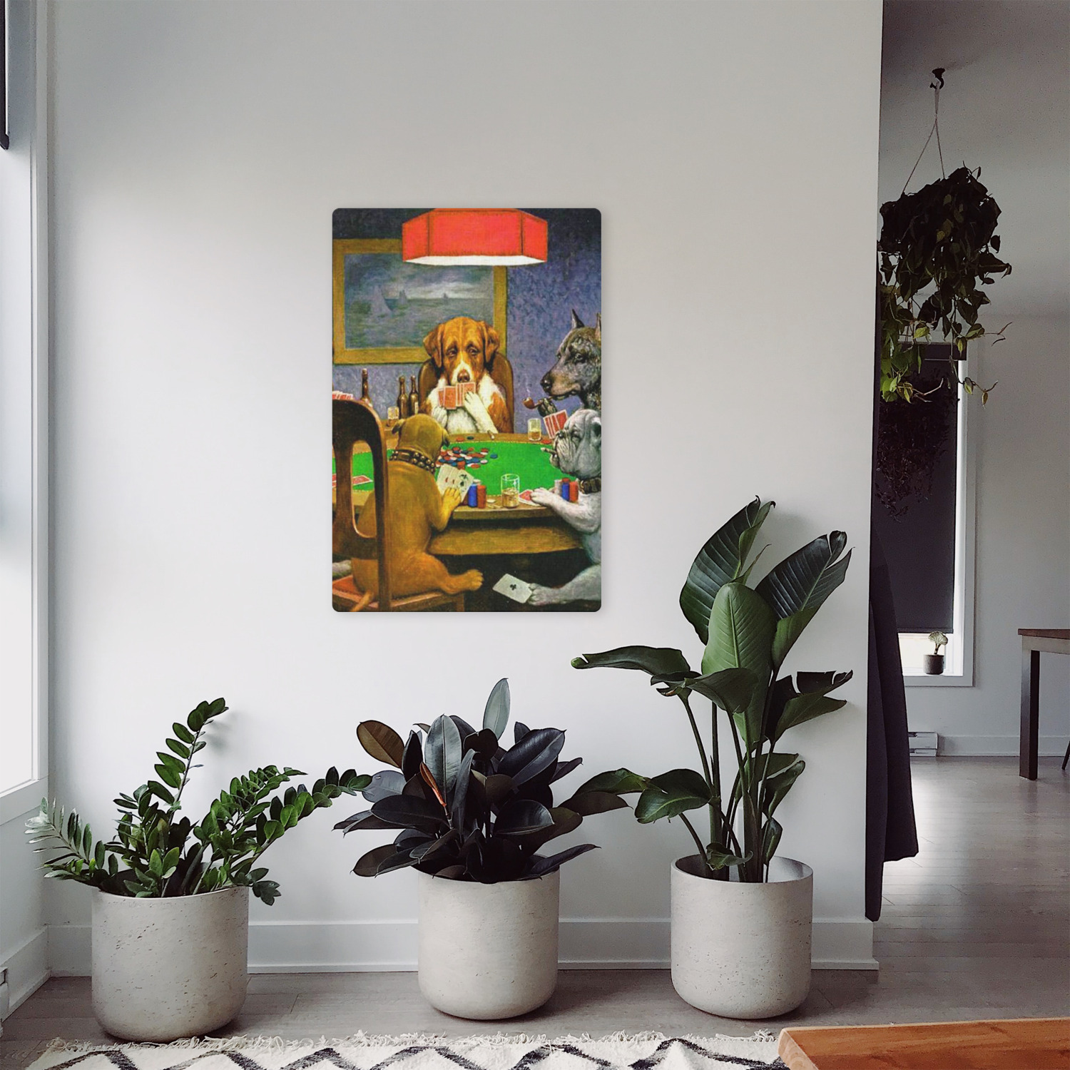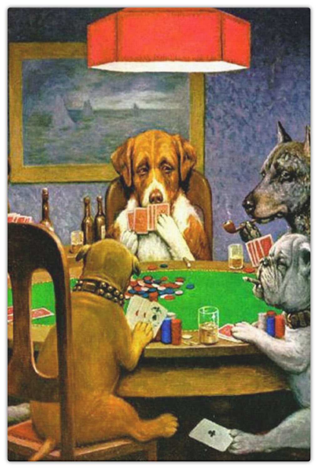 Dogs Playing Poker refers collectively to an 1894 painting, a series of sixteen oil paintings, and a 1910 painting by Cassius Marcellus Coolidge. Brown & Bigelow commissioned the 16 painting series in 1903 to advertise cigars. All eighteen paintings in the series feature personified dogs, but the eleven in which dogs are seated around a card table have become well known in the United States as examples of Kitsch art in home decoration. Source: Wikipedia