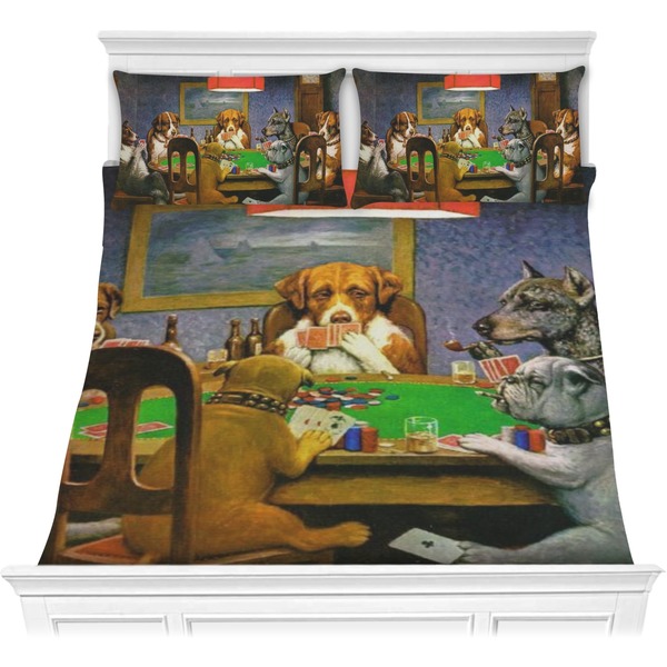 Dogs Playing Poker refers collectively to an 1894 painting, a series of sixteen oil paintings, and a 1910 painting by Cassius Marcellus Coolidge. Brown & Bigelow commissioned the 16 painting series in 1903 to advertise cigars. All eighteen paintings in the series feature personified dogs, but the eleven in which dogs are seated around a card table have become well known in the United States as examples of Kitsch art in home decoration. Source: Wikipedia