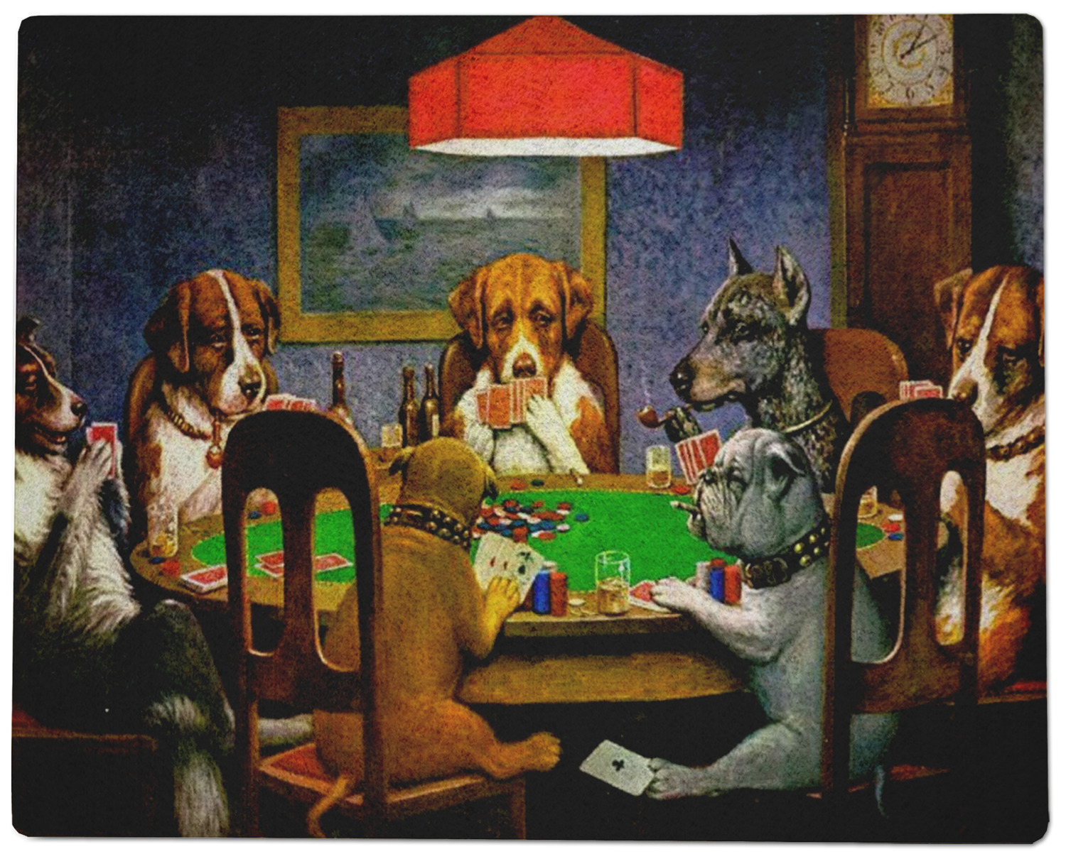 Dogs Playing Poker refers collectively to an 1894 painting, a series of sixteen oil paintings, and a 1910 painting by Cassius Marcellus Coolidge. Brown & Bigelow commissioned the 16 painting series in 1903 to advertise cigars. All eighteen paintings in the series feature personified dogs, but the eleven in which dogs are seated around a card table have become well known in the United States as examples of Kitsch art in home decoration. Source: Wikipedia