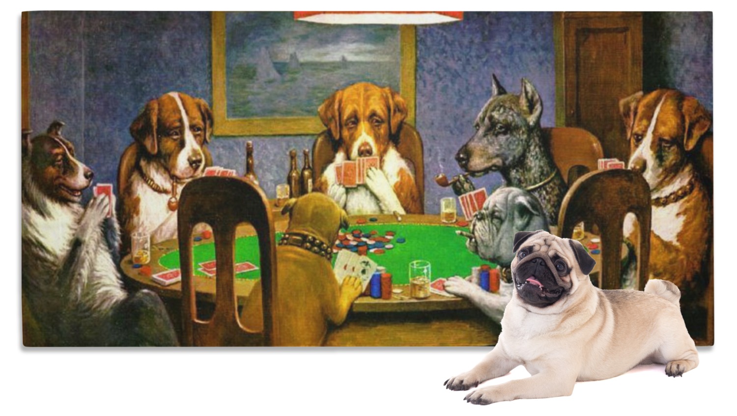 Dogs Playing Poker refers collectively to an 1894 painting, a series of sixteen oil paintings, and a 1910 painting by Cassius Marcellus Coolidge. Brown & Bigelow commissioned the 16 painting series in 1903 to advertise cigars. All eighteen paintings in the series feature personified dogs, but the eleven in which dogs are seated around a card table have become well known in the United States as examples of Kitsch art in home decoration. Source: Wikipedia
