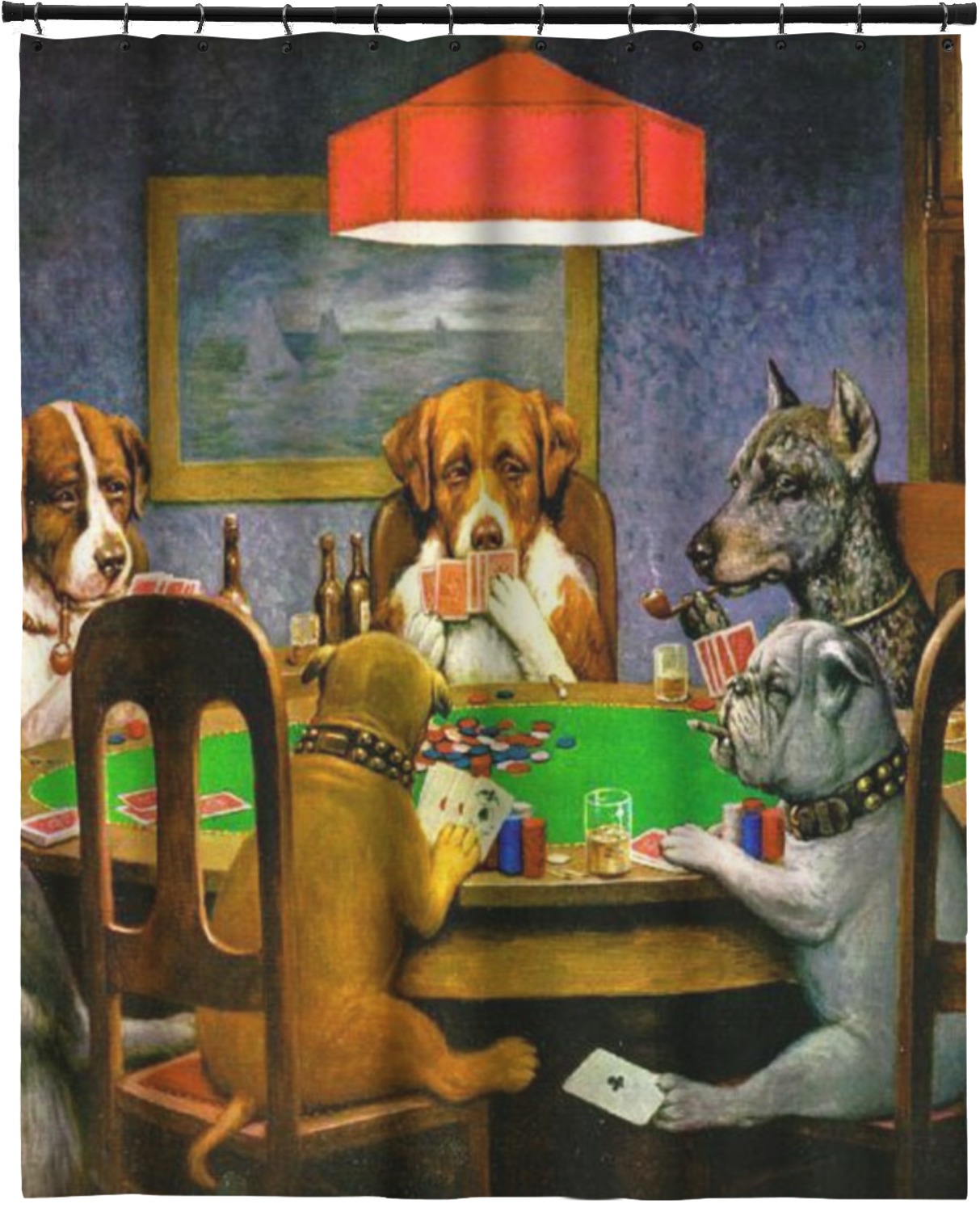 Dogs Playing Poker refers collectively to an 1894 painting, a series of sixteen oil paintings, and a 1910 painting by Cassius Marcellus Coolidge. Brown & Bigelow commissioned the 16 painting series in 1903 to advertise cigars. All eighteen paintings in the series feature personified dogs, but the eleven in which dogs are seated around a card table have become well known in the United States as examples of Kitsch art in home decoration. Source: Wikipedia