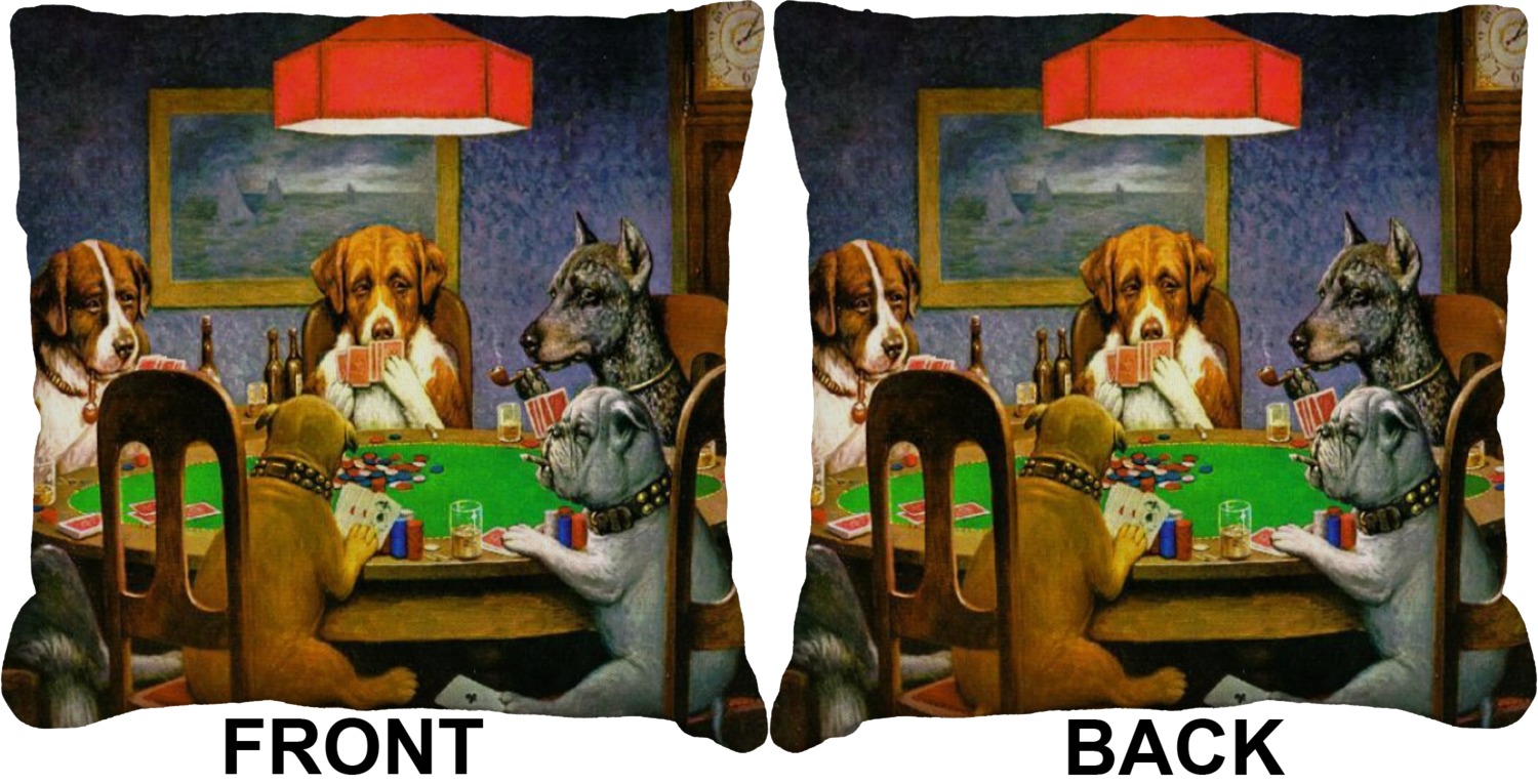 Dogs Playing Poker refers collectively to an 1894 painting, a series of sixteen oil paintings, and a 1910 painting by Cassius Marcellus Coolidge. Brown & Bigelow commissioned the 16 painting series in 1903 to advertise cigars. All eighteen paintings in the series feature personified dogs, but the eleven in which dogs are seated around a card table have become well known in the United States as examples of Kitsch art in home decoration. Source: Wikipedia