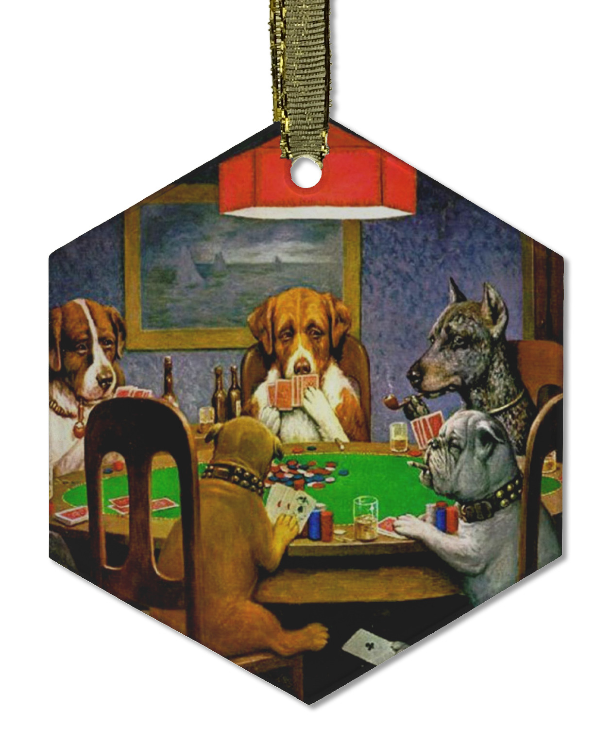 Dogs Playing Poker refers collectively to an 1894 painting, a series of sixteen oil paintings, and a 1910 painting by Cassius Marcellus Coolidge. Brown & Bigelow commissioned the 16 painting series in 1903 to advertise cigars. All eighteen paintings in the series feature personified dogs, but the eleven in which dogs are seated around a card table have become well known in the United States as examples of Kitsch art in home decoration. Source: Wikipedia