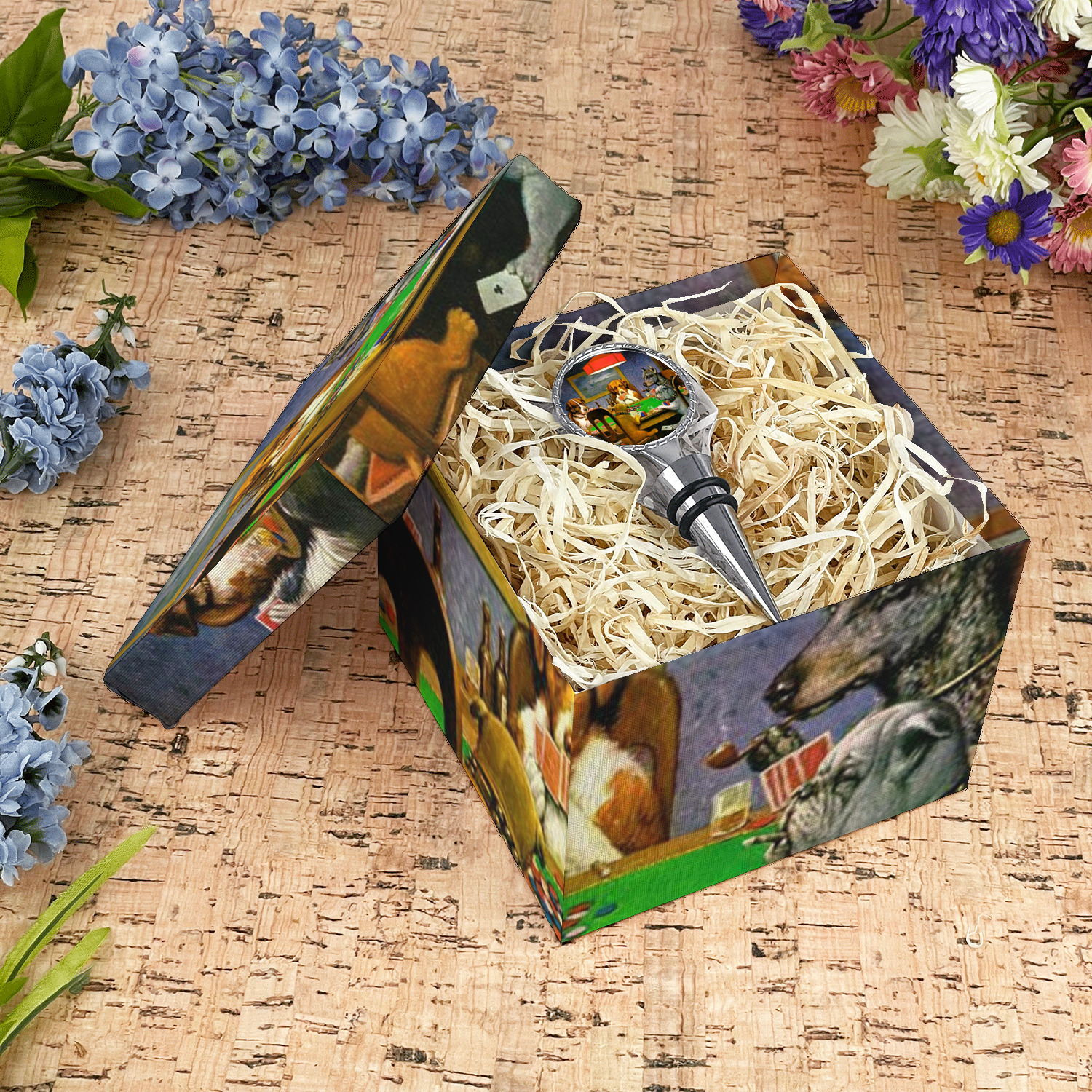 Dogs Playing Poker refers collectively to an 1894 painting, a series of sixteen oil paintings, and a 1910 painting by Cassius Marcellus Coolidge. Brown & Bigelow commissioned the 16 painting series in 1903 to advertise cigars. All eighteen paintings in the series feature personified dogs, but the eleven in which dogs are seated around a card table have become well known in the United States as examples of Kitsch art in home decoration. Source: Wikipedia