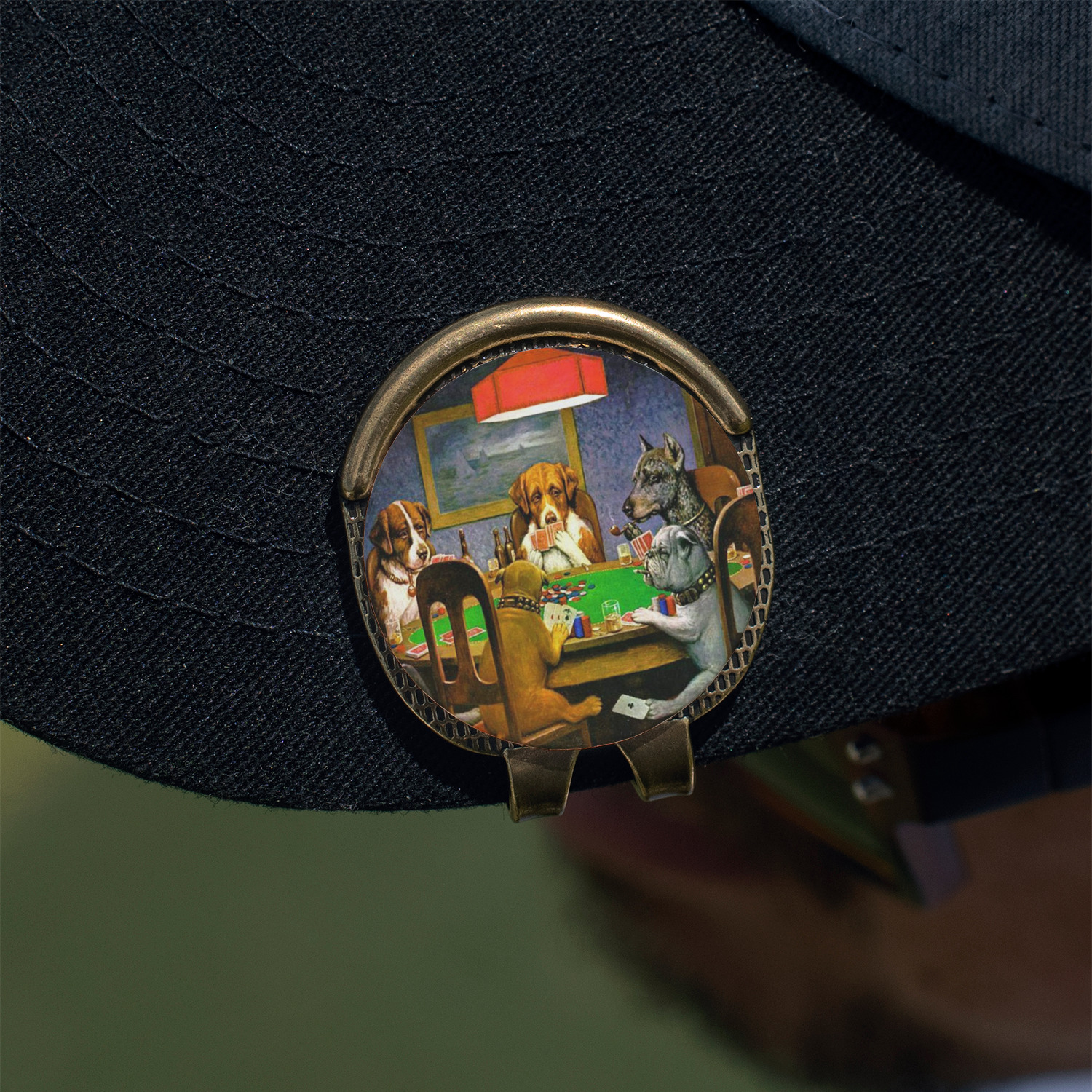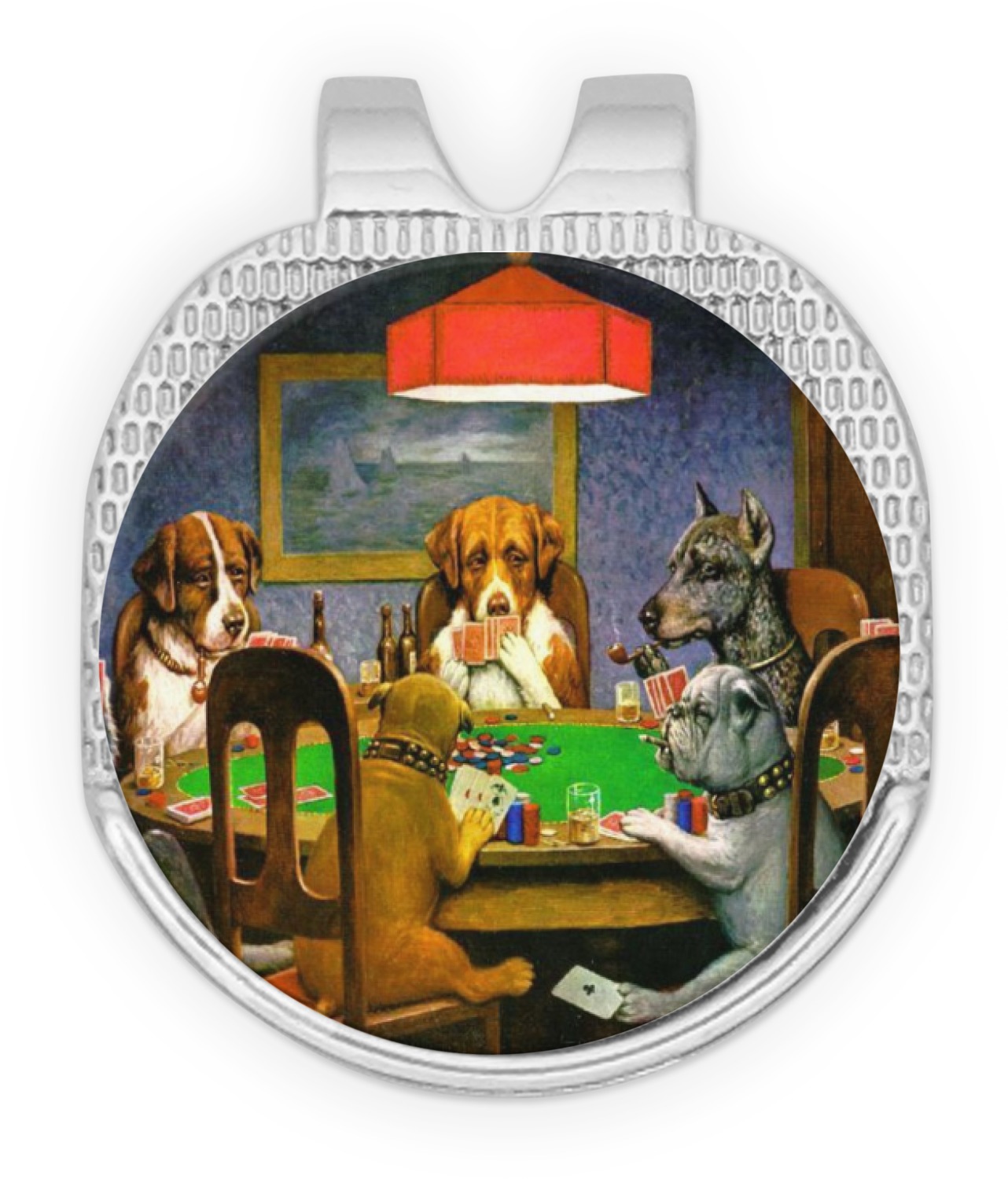 Dogs Playing Poker refers collectively to an 1894 painting, a series of sixteen oil paintings, and a 1910 painting by Cassius Marcellus Coolidge. Brown & Bigelow commissioned the 16 painting series in 1903 to advertise cigars. All eighteen paintings in the series feature personified dogs, but the eleven in which dogs are seated around a card table have become well known in the United States as examples of Kitsch art in home decoration. Source: Wikipedia