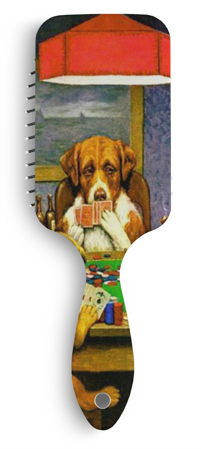 The hair brush is 7" long x 3" wide x 1.75" high. The shaped brush handle has a comfortable grip. The handle has a hole at the bottom for hanging the brush.