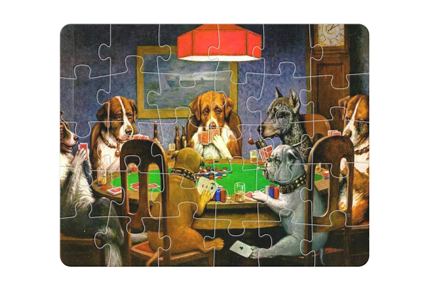 Dogs Playing Poker refers collectively to an 1894 painting, a series of sixteen oil paintings, and a 1910 painting by Cassius Marcellus Coolidge. Brown & Bigelow commissioned the 16 painting series in 1903 to advertise cigars. All eighteen paintings in the series feature personified dogs, but the eleven in which dogs are seated around a card table have become well known in the United States as examples of Kitsch art in home decoration. Source: Wikipedia