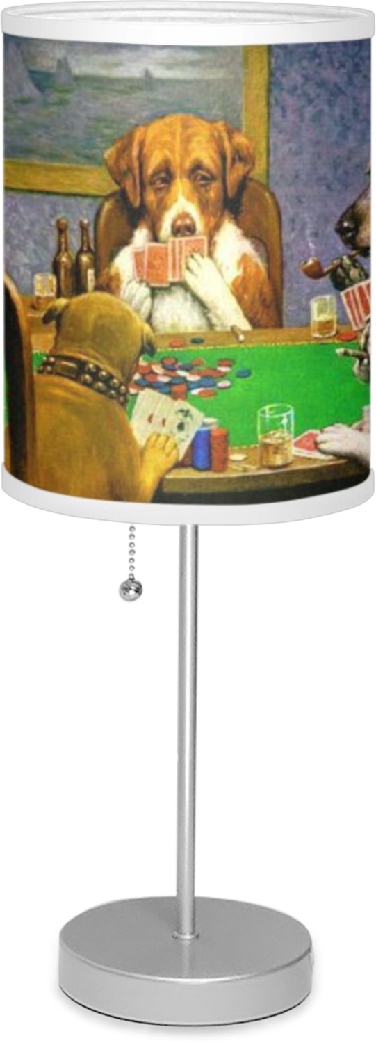 Dogs Playing Poker refers collectively to an 1894 painting, a series of sixteen oil paintings, and a 1910 painting by Cassius Marcellus Coolidge. Brown & Bigelow commissioned the 16 painting series in 1903 to advertise cigars. All eighteen paintings in the series feature personified dogs, but the eleven in which dogs are seated around a card table have become well known in the United States as examples of Kitsch art in home decoration. Source: Wikipedia