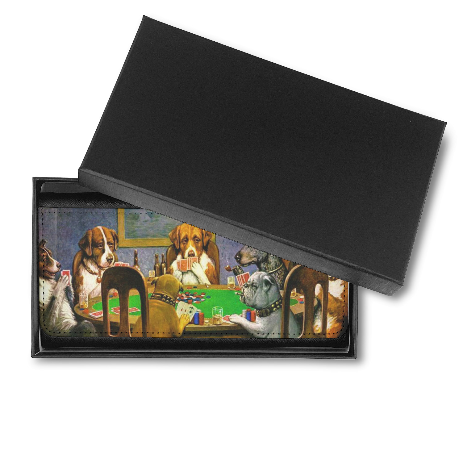 Dogs Playing Poker refers collectively to an 1894 painting, a series of sixteen oil paintings, and a 1910 painting by Cassius Marcellus Coolidge. Brown & Bigelow commissioned the 16 painting series in 1903 to advertise cigars. All eighteen paintings in the series feature personified dogs, but the eleven in which dogs are seated around a card table have become well known in the United States as examples of Kitsch art in home decoration. Source: Wikipedia