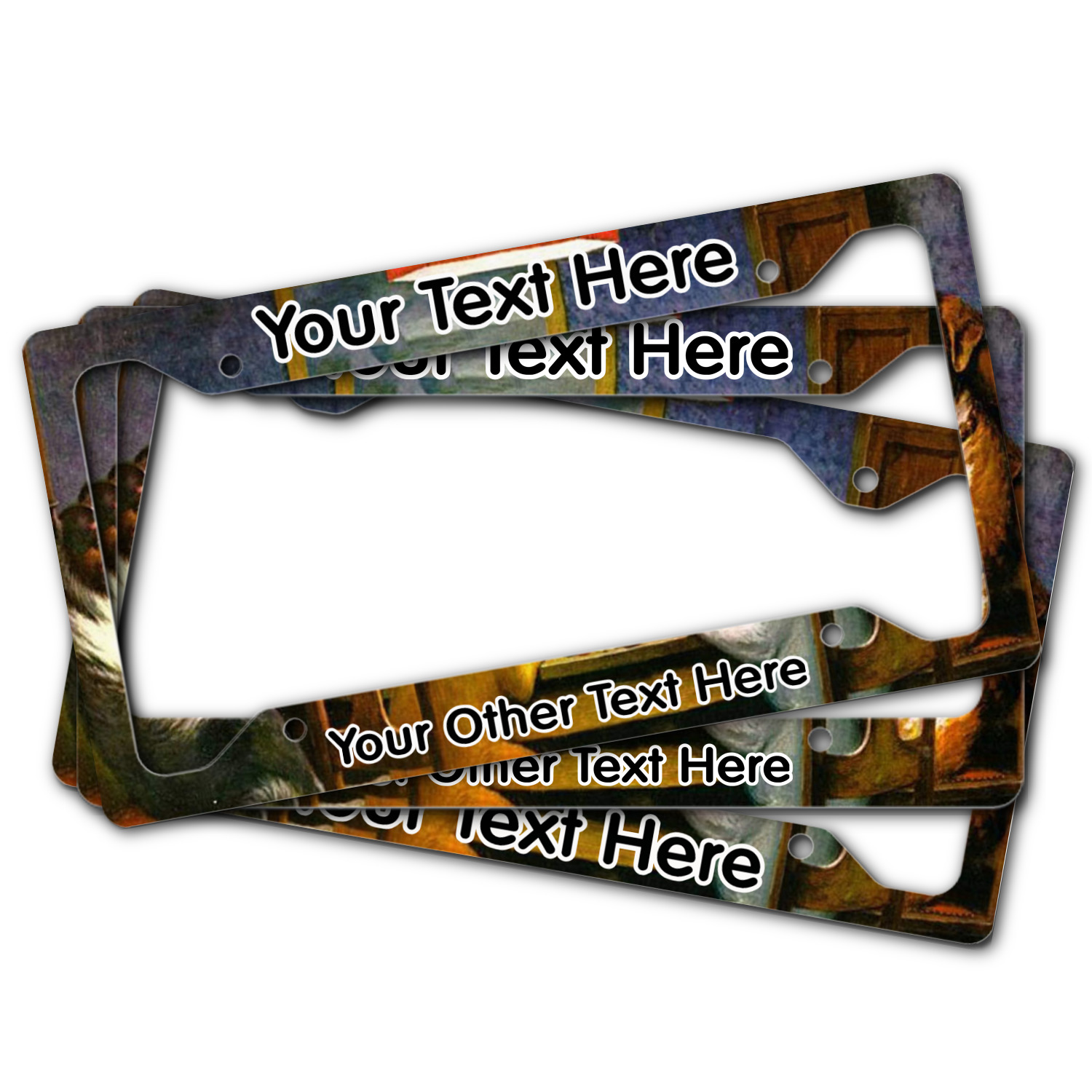 Each customizable license plate frame is made from a fine, yet sturdy aluminum material that measures approximately 6.5 x 12.15 inches, accommodating most standard license plates. The thickness allows the license plate frame to adhere completely to your license plate for a seamless look. We carry 3 styles of license plate frames to customize - Style A has texts on top and bottom, Style B offers texts on top and bottom as well as a full fill bottom border, and Style C offers text at the bottom only. The personalized license plate frame comes with four mounting holes for easy installation! We print each custom design across the frame with a glossy finish.