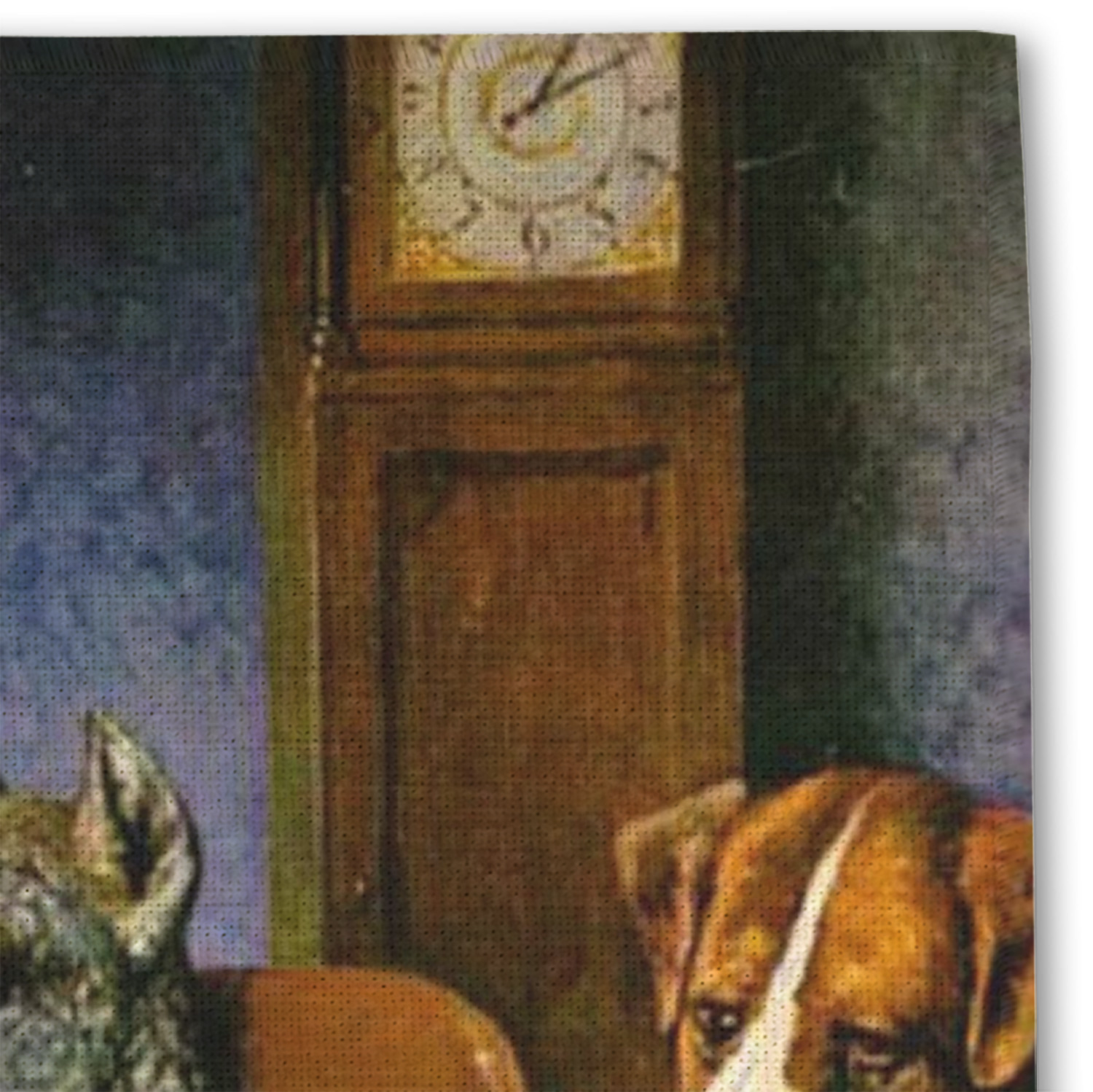 Dogs Playing Poker refers collectively to an 1894 painting, a series of sixteen oil paintings, and a 1910 painting by Cassius Marcellus Coolidge. Brown & Bigelow commissioned the 16 painting series in 1903 to advertise cigars. All eighteen paintings in the series feature personified dogs, but the eleven in which dogs are seated around a card table have become well known in the United States as examples of Kitsch art in home decoration. Source: Wikipedia