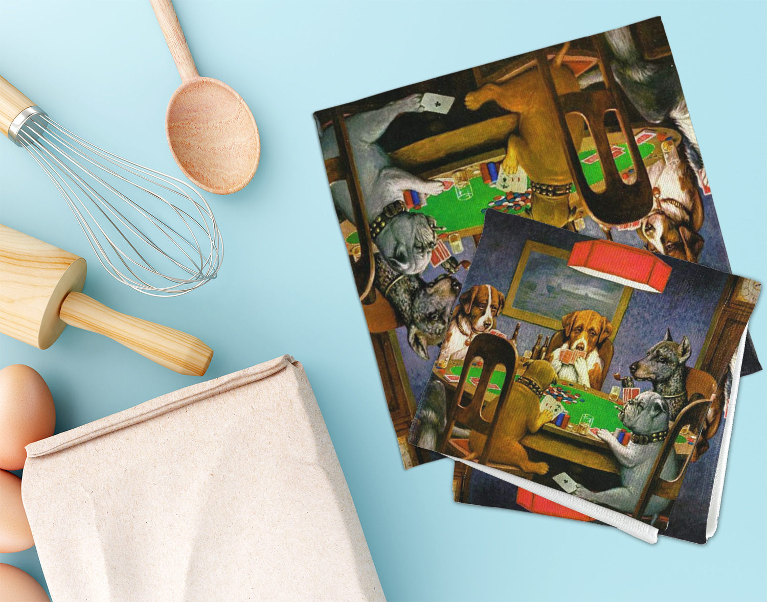 Dogs Playing Poker refers collectively to an 1894 painting, a series of sixteen oil paintings, and a 1910 painting by Cassius Marcellus Coolidge. Brown & Bigelow commissioned the 16 painting series in 1903 to advertise cigars. All eighteen paintings in the series feature personified dogs, but the eleven in which dogs are seated around a card table have become well known in the United States as examples of Kitsch art in home decoration. Source: Wikipedia