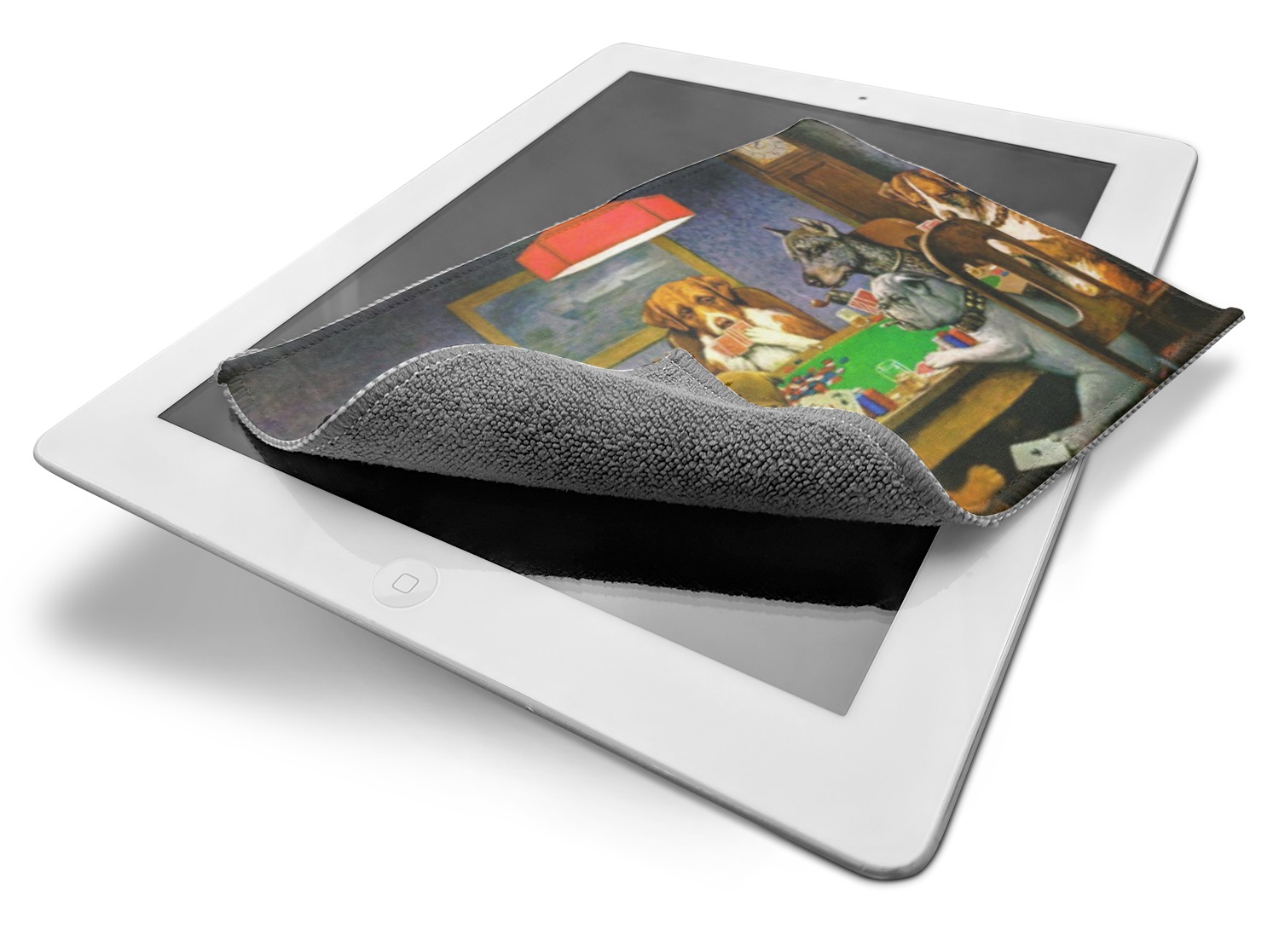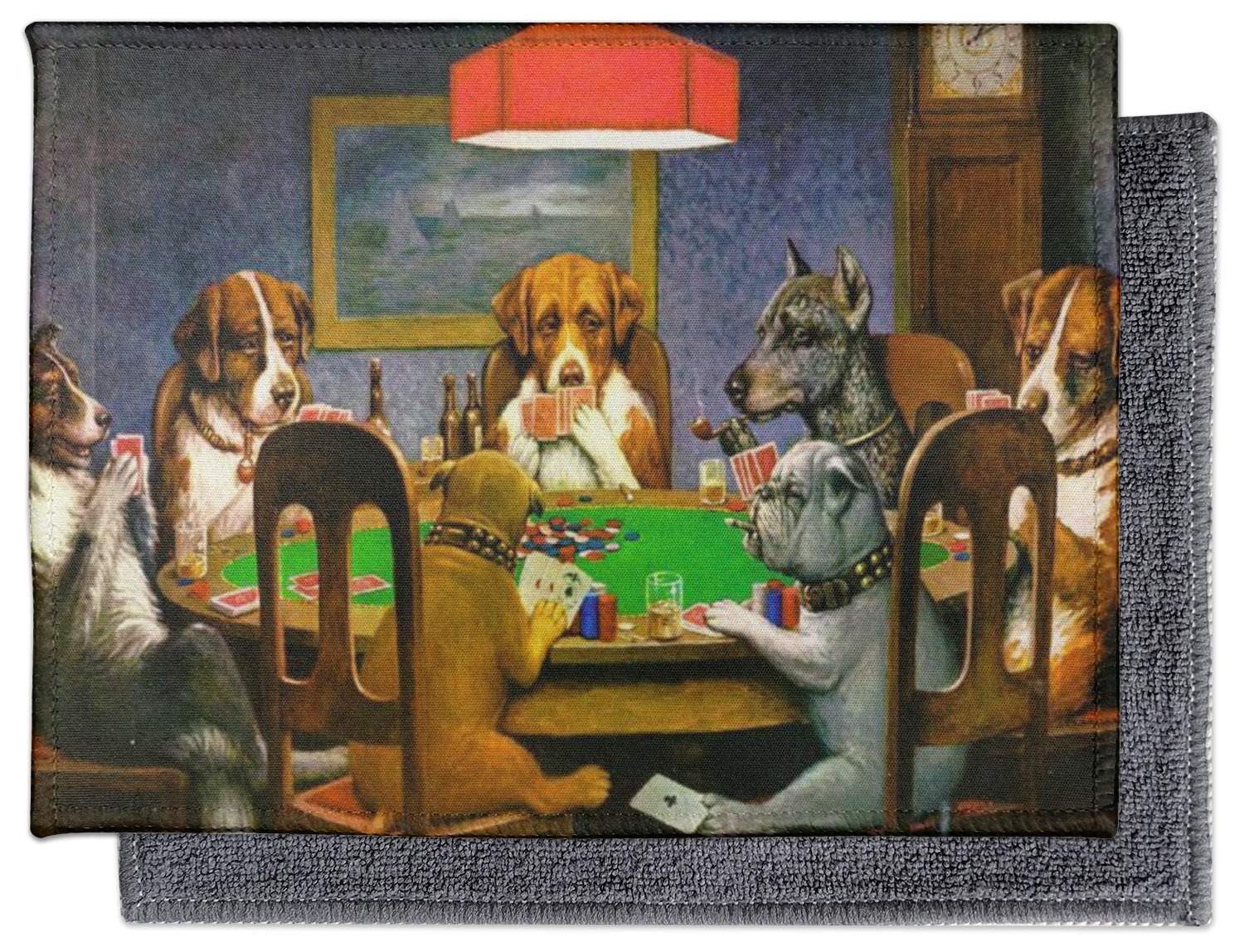 Dogs Playing Poker refers collectively to an 1894 painting, a series of sixteen oil paintings, and a 1910 painting by Cassius Marcellus Coolidge. Brown & Bigelow commissioned the 16 painting series in 1903 to advertise cigars. All eighteen paintings in the series feature personified dogs, but the eleven in which dogs are seated around a card table have become well known in the United States as examples of Kitsch art in home decoration. Source: Wikipedia