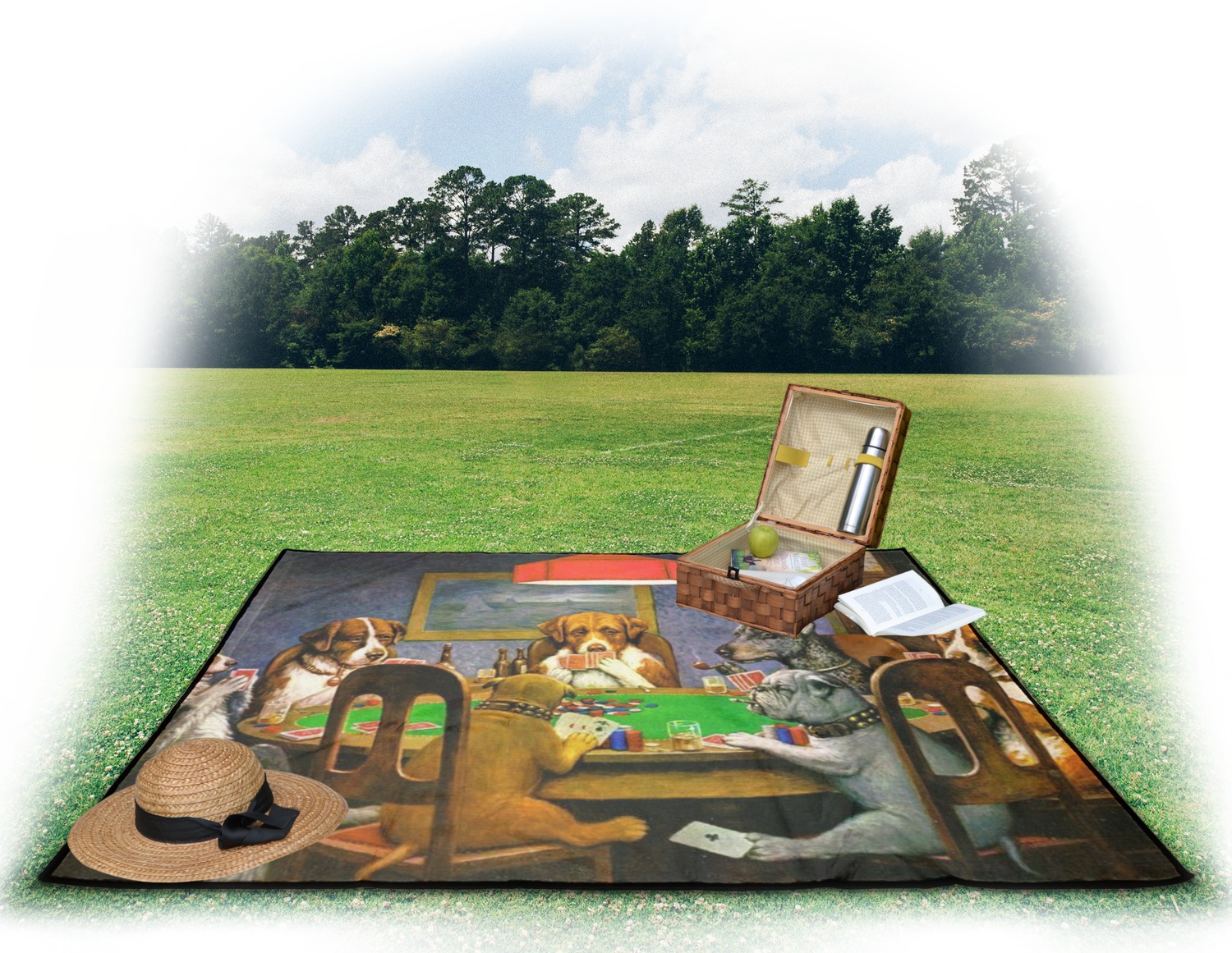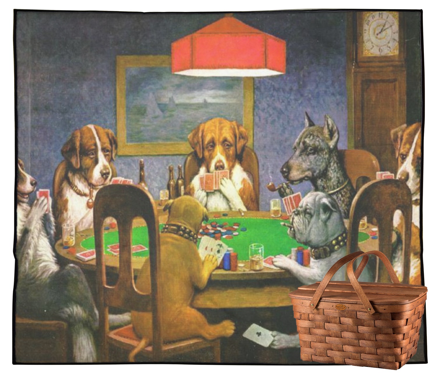 Dogs Playing Poker refers collectively to an 1894 painting, a series of sixteen oil paintings, and a 1910 painting by Cassius Marcellus Coolidge. Brown & Bigelow commissioned the 16 painting series in 1903 to advertise cigars. All eighteen paintings in the series feature personified dogs, but the eleven in which dogs are seated around a card table have become well known in the United States as examples of Kitsch art in home decoration. Source: Wikipedia