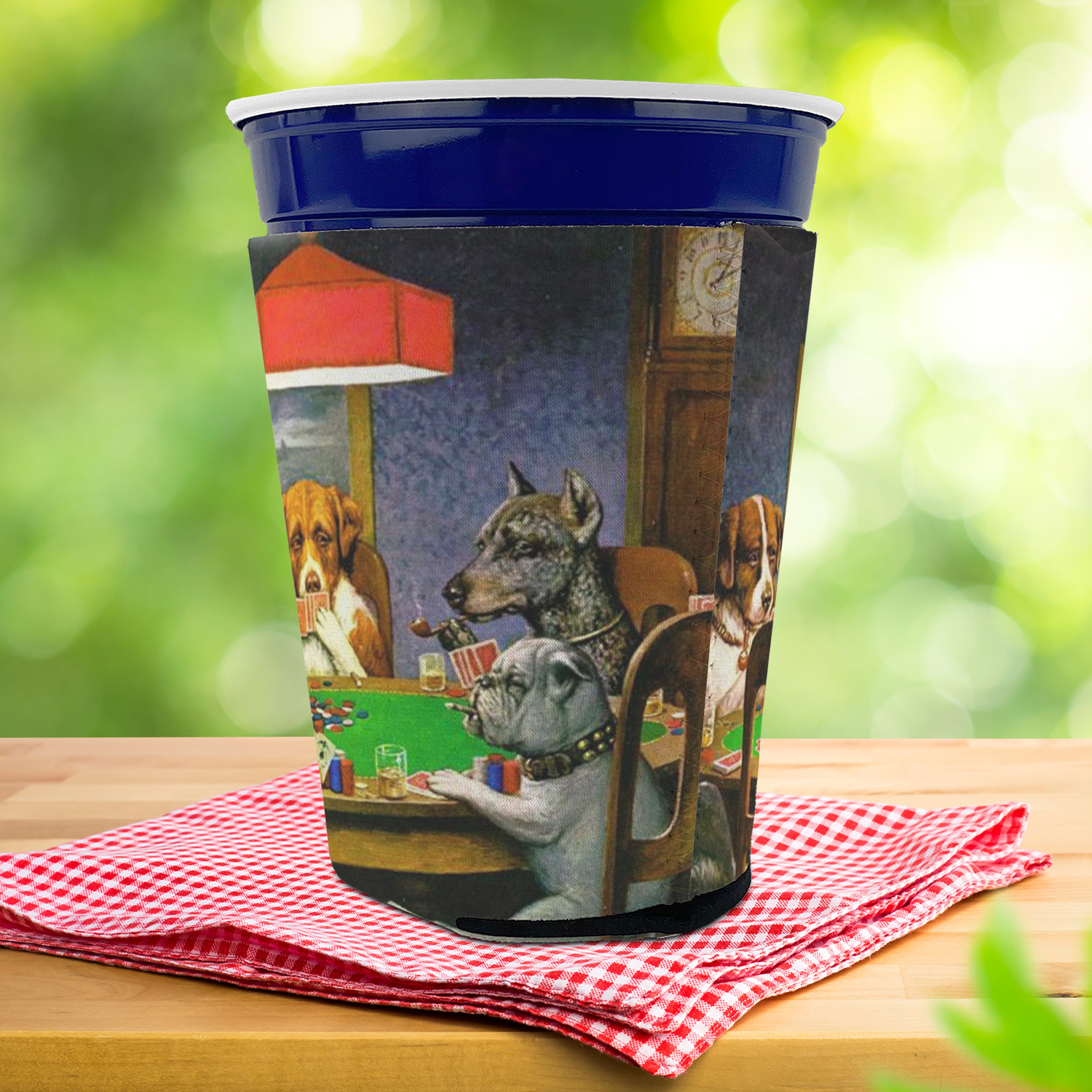 Made from neoprene with a polyester outer fabric and sewn seams, these premium quality party cup sleeves are very durable and will hold up to heavy use. They are available in 2 styles - with a bottom or just a sleeve to go around the outside of the tapered cup. The sleeve covers are about 4" tall and cover about 90% of the classic 16 oz. Solo cup.