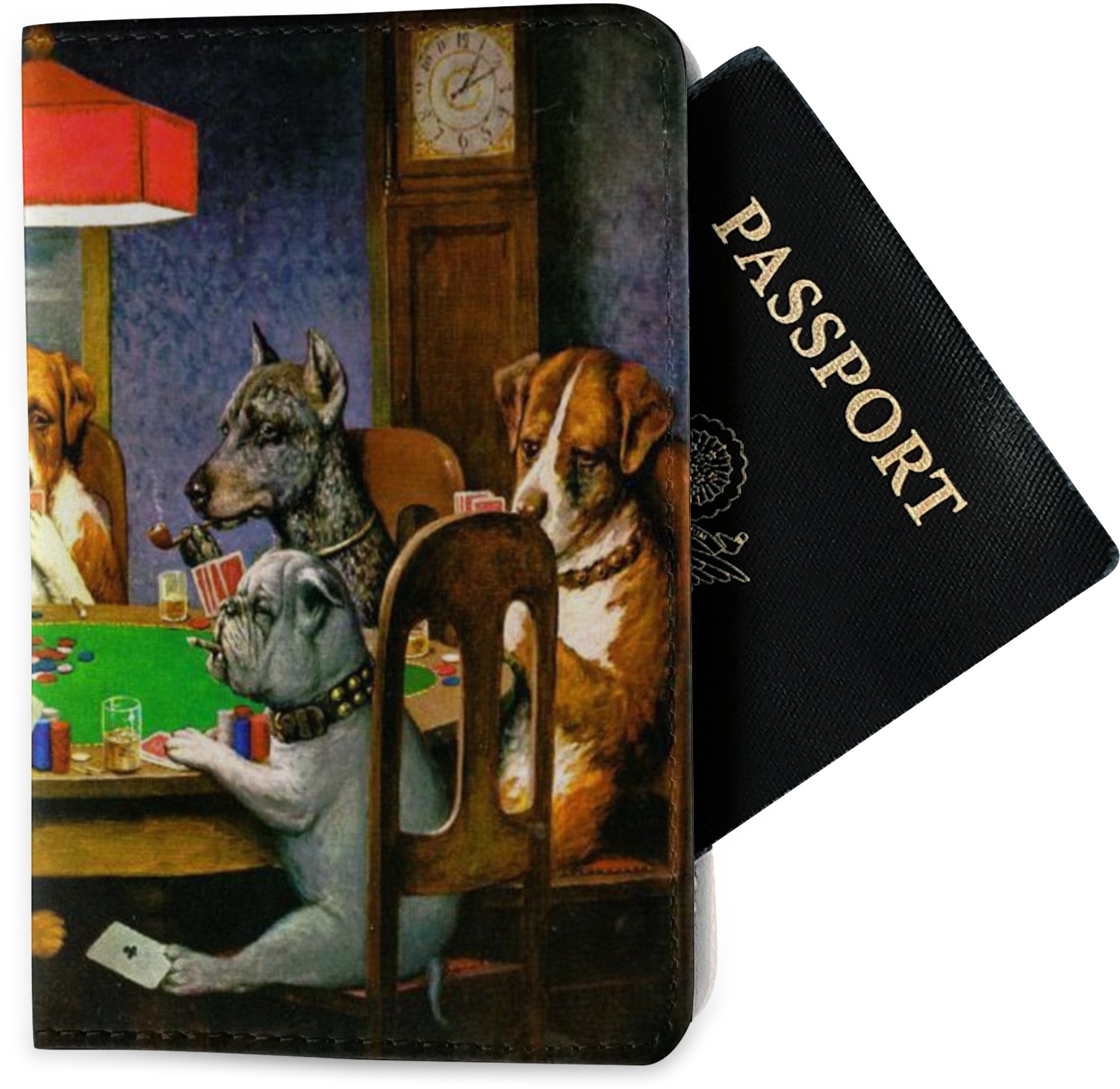 Dogs Playing Poker refers collectively to an 1894 painting, a series of sixteen oil paintings, and a 1910 painting by Cassius Marcellus Coolidge. Brown & Bigelow commissioned the 16 painting series in 1903 to advertise cigars. All eighteen paintings in the series feature personified dogs, but the eleven in which dogs are seated around a card table have become well known in the United States as examples of Kitsch art in home decoration. Source: Wikipedia