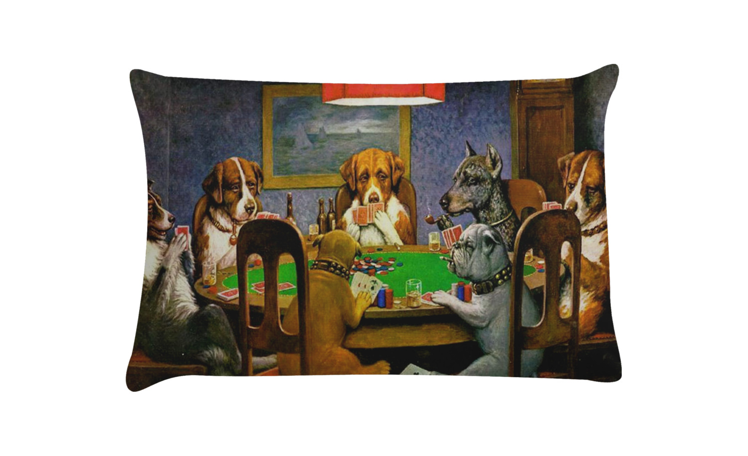 Dogs Playing Poker refers collectively to an 1894 painting, a series of sixteen oil paintings, and a 1910 painting by Cassius Marcellus Coolidge. Brown & Bigelow commissioned the 16 painting series in 1903 to advertise cigars. All eighteen paintings in the series feature personified dogs, but the eleven in which dogs are seated around a card table have become well known in the United States as examples of Kitsch art in home decoration. Source: Wikipedia