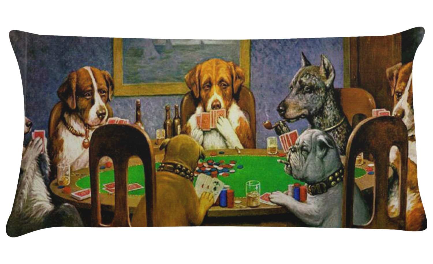 Dogs Playing Poker refers collectively to an 1894 painting, a series of sixteen oil paintings, and a 1910 painting by Cassius Marcellus Coolidge. Brown & Bigelow commissioned the 16 painting series in 1903 to advertise cigars. All eighteen paintings in the series feature personified dogs, but the eleven in which dogs are seated around a card table have become well known in the United States as examples of Kitsch art in home decoration. Source: Wikipedia