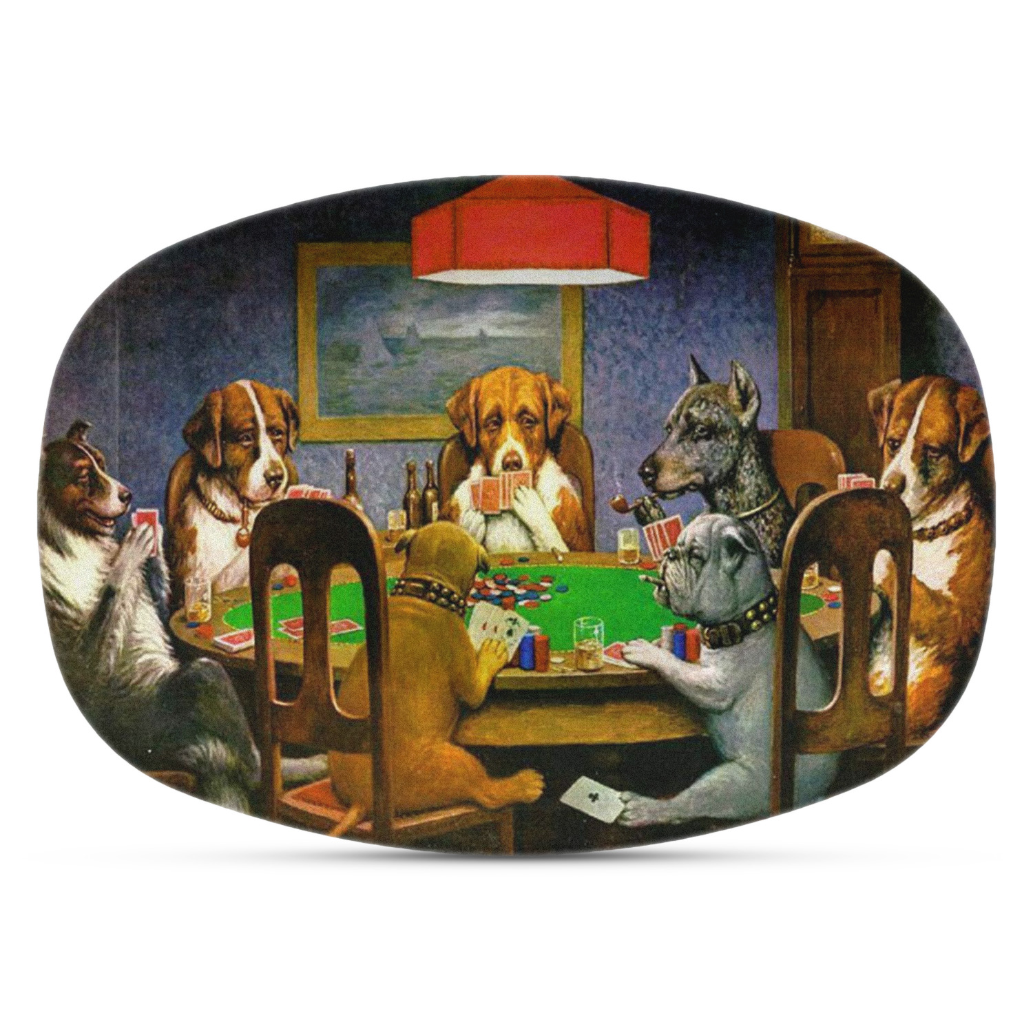 Dogs Playing Poker refers collectively to an 1894 painting, a series of sixteen oil paintings, and a 1910 painting by Cassius Marcellus Coolidge. Brown & Bigelow commissioned the 16 painting series in 1903 to advertise cigars. All eighteen paintings in the series feature personified dogs, but the eleven in which dogs are seated around a card table have become well known in the United States as examples of Kitsch art in home decoration. Source: Wikipedia