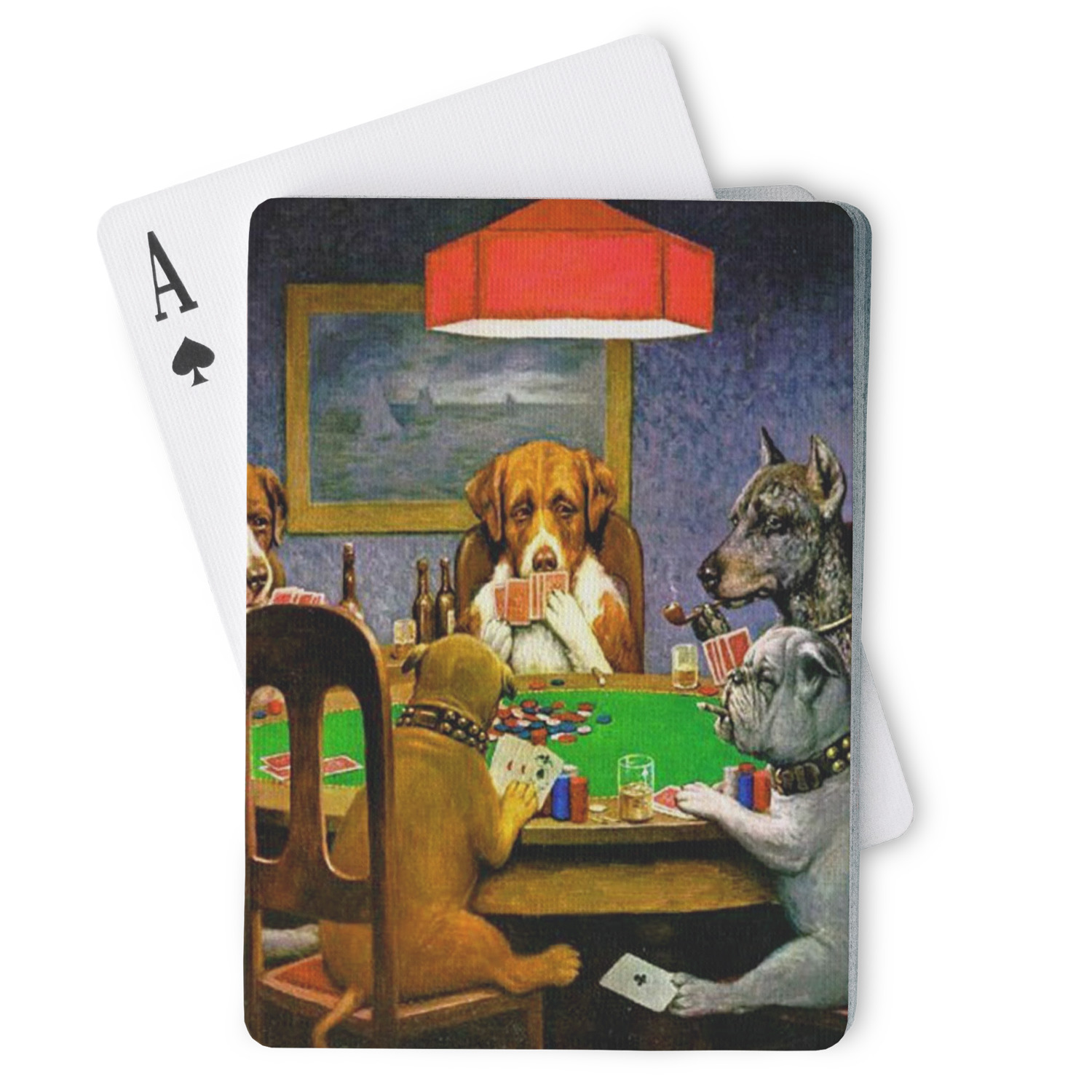 Dogs Playing Poker refers collectively to an 1894 painting, a series of sixteen oil paintings, and a 1910 painting by Cassius Marcellus Coolidge. Brown & Bigelow commissioned the 16 painting series in 1903 to advertise cigars. All eighteen paintings in the series feature personified dogs, but the eleven in which dogs are seated around a card table have become well known in the United States as examples of Kitsch art in home decoration. Source: Wikipedia