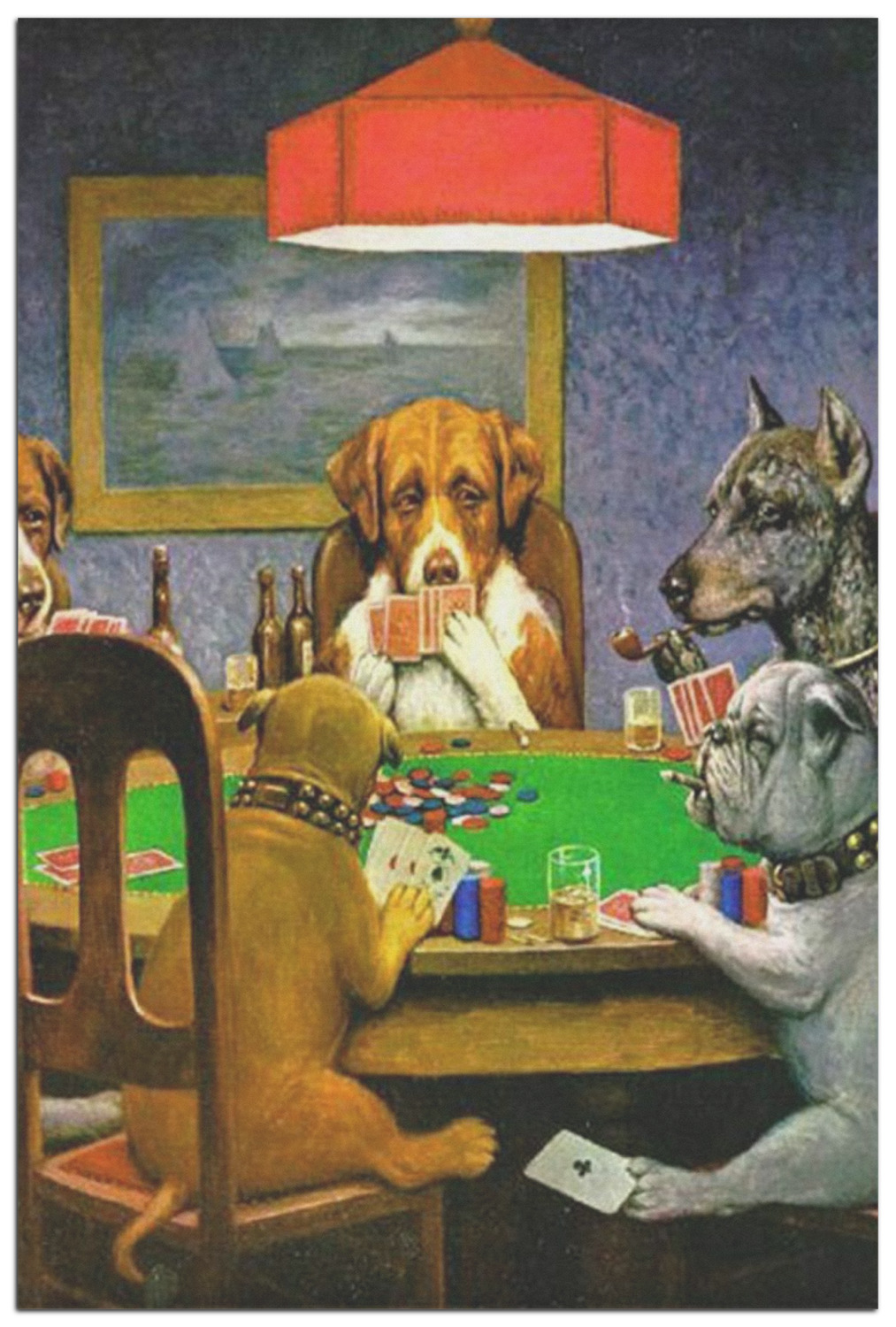 Dogs Playing Poker refers collectively to an 1894 painting, a series of sixteen oil paintings, and a 1910 painting by Cassius Marcellus Coolidge. Brown & Bigelow commissioned the 16 painting series in 1903 to advertise cigars. All eighteen paintings in the series feature personified dogs, but the eleven in which dogs are seated around a card table have become well known in the United States as examples of Kitsch art in home decoration. Source: Wikipedia