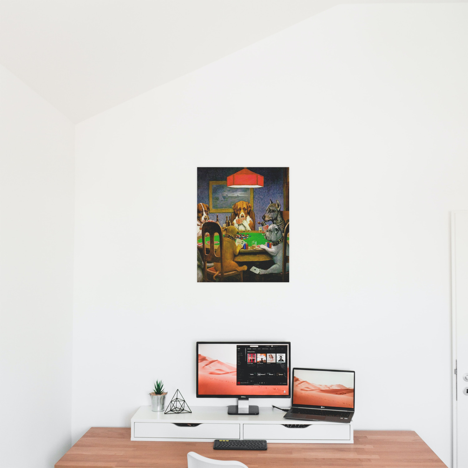 Dogs Playing Poker refers collectively to an 1894 painting, a series of sixteen oil paintings, and a 1910 painting by Cassius Marcellus Coolidge. Brown & Bigelow commissioned the 16 painting series in 1903 to advertise cigars. All eighteen paintings in the series feature personified dogs, but the eleven in which dogs are seated around a card table have become well known in the United States as examples of Kitsch art in home decoration. Source: Wikipedia