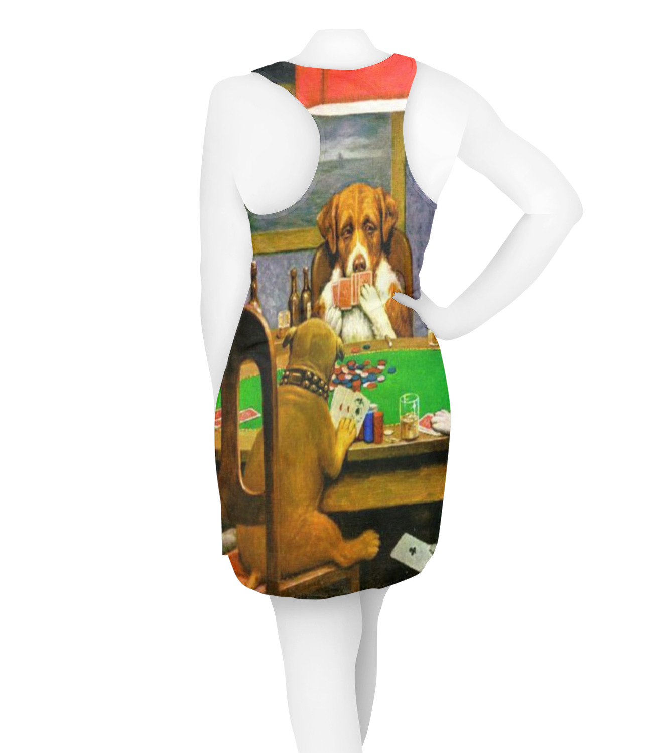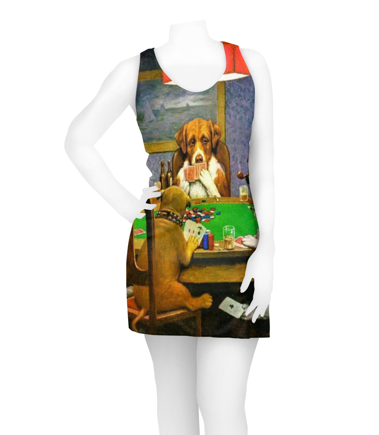 Dogs Playing Poker refers collectively to an 1894 painting, a series of sixteen oil paintings, and a 1910 painting by Cassius Marcellus Coolidge. Brown & Bigelow commissioned the 16 painting series in 1903 to advertise cigars. All eighteen paintings in the series feature personified dogs, but the eleven in which dogs are seated around a card table have become well known in the United States as examples of Kitsch art in home decoration. Source: Wikipedia