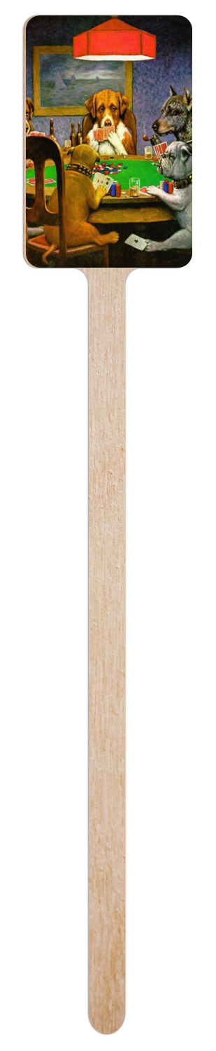 Dogs Playing Poker refers collectively to an 1894 painting, a series of sixteen oil paintings, and a 1910 painting by Cassius Marcellus Coolidge. Brown & Bigelow commissioned the 16 painting series in 1903 to advertise cigars. All eighteen paintings in the series feature personified dogs, but the eleven in which dogs are seated around a card table have become well known in the United States as examples of Kitsch art in home decoration. Source: Wikipedia